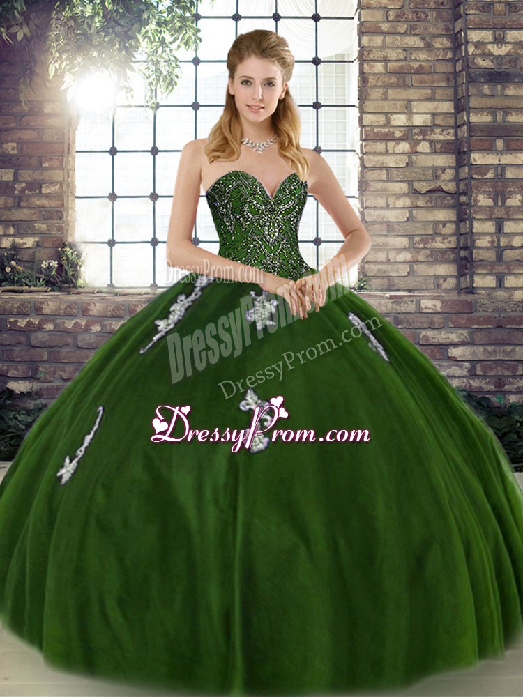 Neckline : SweetheartShown Color : Olive GreenSilhouette : Ball GownsSleeve Length : sleevelessHemline : floor lengthBack Detail : Lace upFabric : TulleEmbellishment : Beading,AppliquesOccasion : Military Ball,Sweet 16,QuinceaneraSeason : Spring,Summer,Fall,Winter
