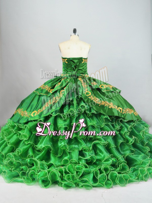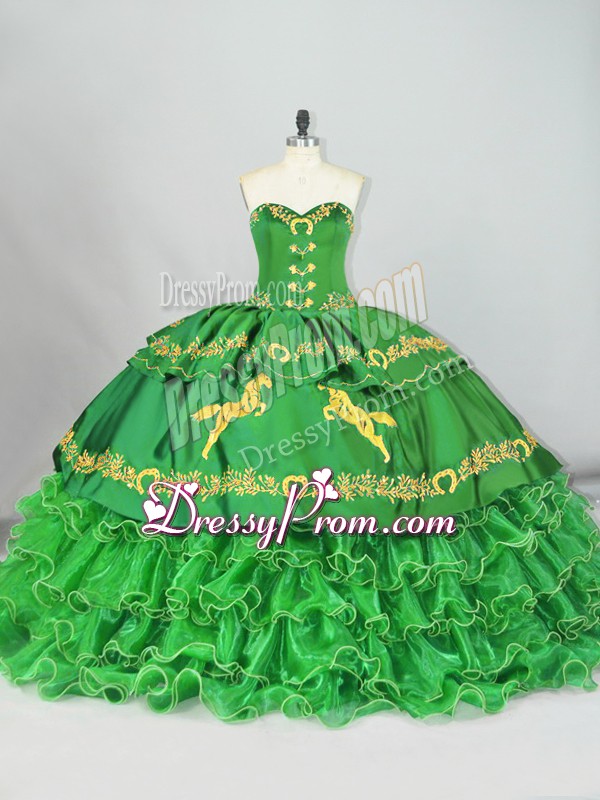 Neckline : SweetheartShown Color : GreenSilhouette : Ball GownsSleeve Length : sleevelessBack Detail : Lace upFabric : Satin,OrganzaEmbellishment : Embroidery,Ruffled LayersOccasion : Sweet 16,QuinceaneraSeason : Spring,Summer,Fall,Winter