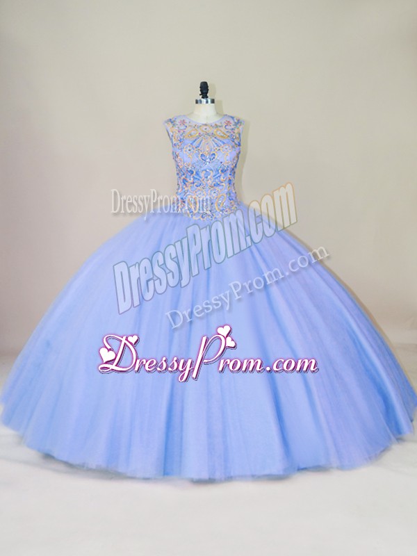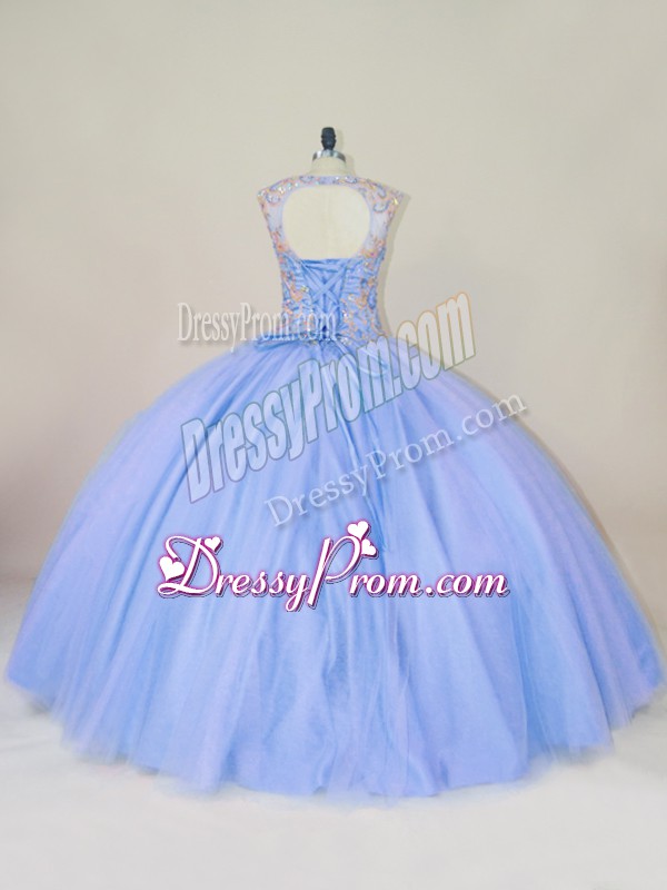 Neckline : ScoopShown Color : LavenderSilhouette : Ball GownsSleeve Length : sleevelessHemline : floor lengthBack Detail : Lace upFabric : TulleEmbellishment : BeadingOccasion : Sweet 16,QuinceaneraSeason : Spring,Summer,Fall,Winter