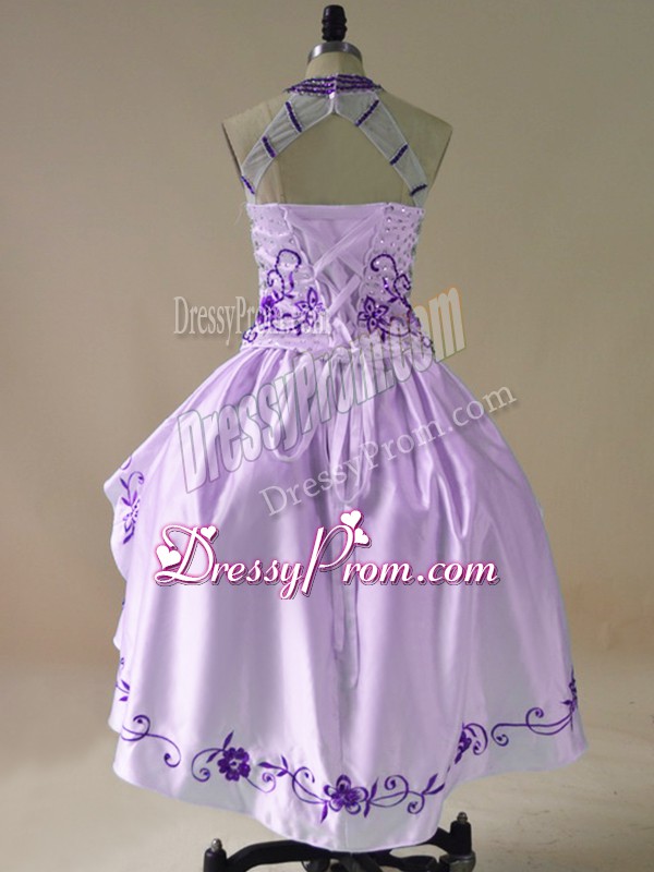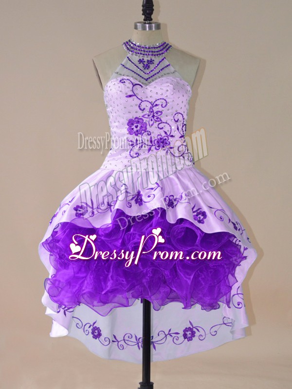 Neckline : Halter topShown Color : PurpleSilhouette : Ball GownsSleeve Length : long sleevesHemline : high lowBack Detail : Lace upFabric : Satin,OrganzaEmbellishment : Embroidery,RufflesOccasion : Prom,Party,Military BallSeason : Spring,Summer,Fall,Winter