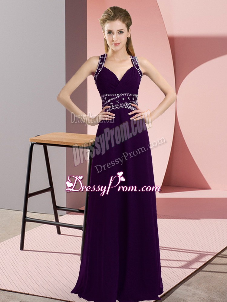 Neckline : StrapsShown Color : PurpleSilhouette : EmpireSleeve Length : sleevelessHemline : floor lengthBack Detail : BacklessFabric : ChiffonEmbellishment : BeadingOccasion : Prom,PartySeason : Spring,Summer,Fall,Winter