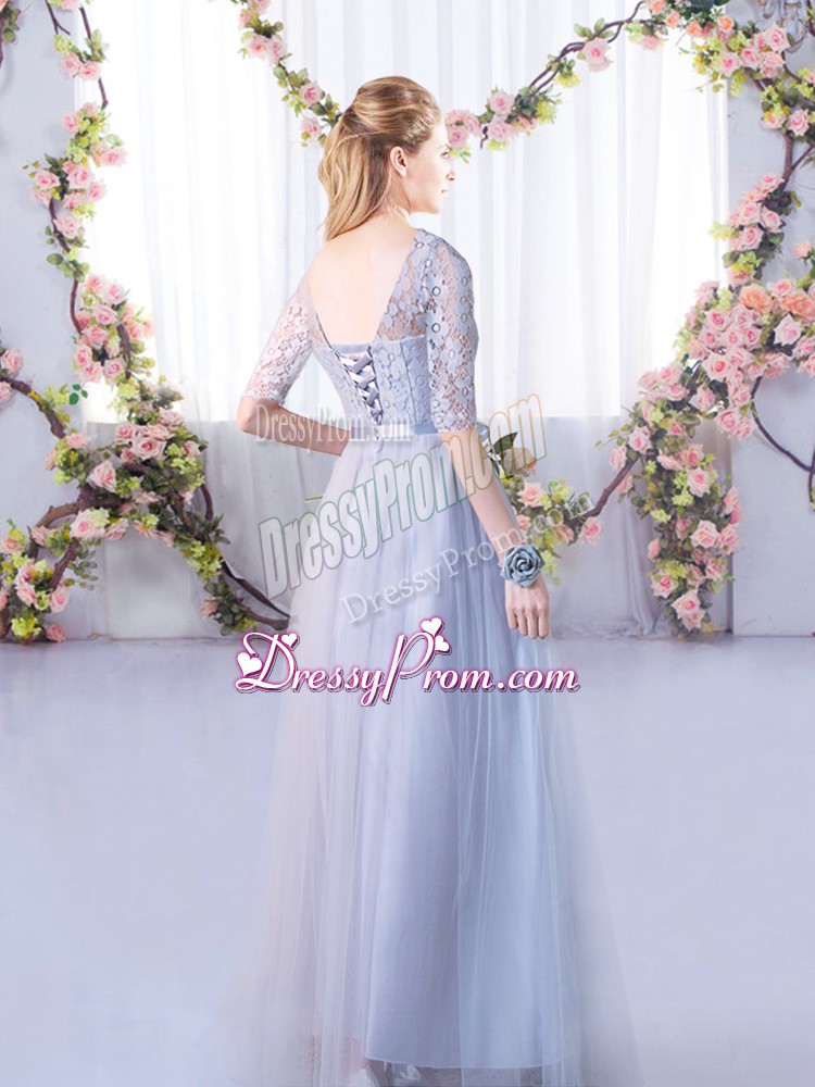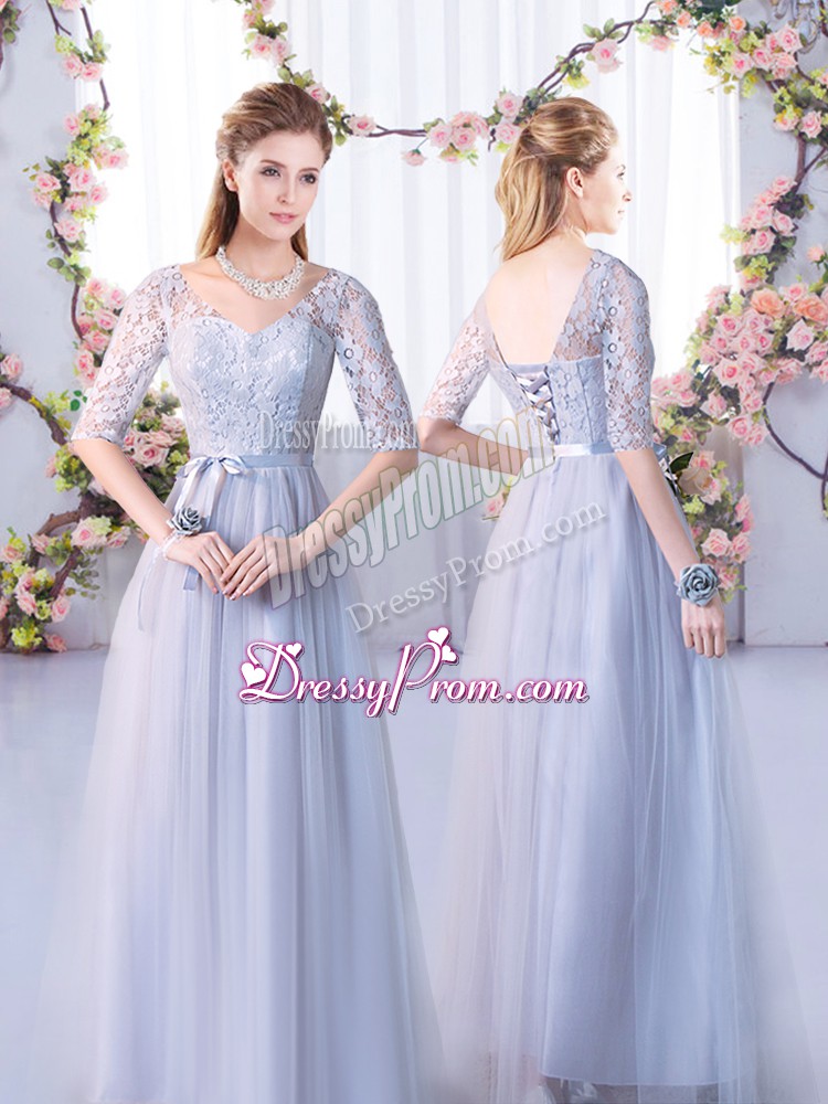 Neckline : V-neckShown Color : GreySilhouette : EmpireSleeve Length : half sleevesHemline : floor lengthBack Detail : Lace upFabric : TulleEmbellishment : LaceOccasion : Wedding PartySeason : Spring,Summer,Fall,Winter