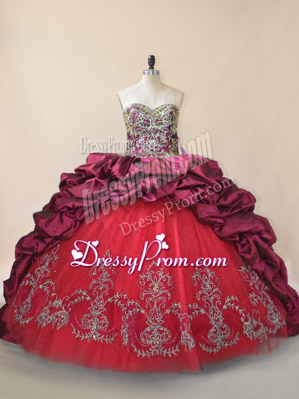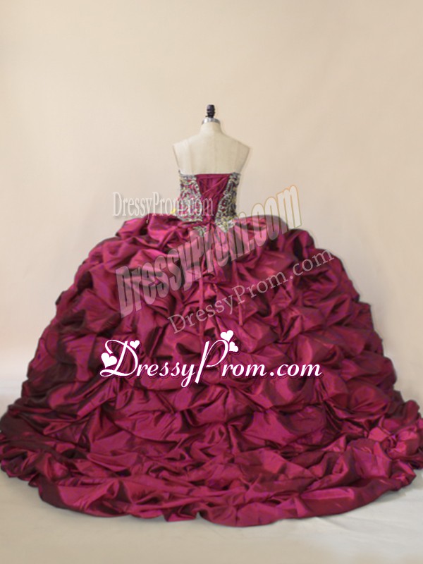 Neckline : SweetheartShown Color : FuchsiaSilhouette : Ball GownsSleeve Length : sleevelessBack Detail : Lace upFabric : Taffeta,TulleEmbellishment : Beading,Pick UpsOccasion : Sweet 16,QuinceaneraSeason : Spring,Summer,Fall,Winter