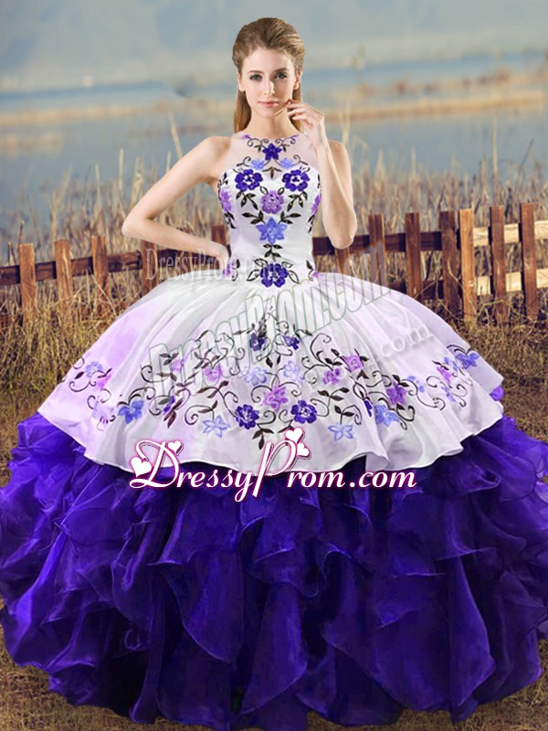 Neckline : Halter topShown Color : White And PurpleSilhouette : Ball GownsSleeve Length : sleevelessHemline : floor lengthBack Detail : Lace upFabric : OrganzaEmbellishment : Embroidery,RufflesOccasion : Sweet 16,QuinceaneraSeason : Spring,Summer,Fall,Winter