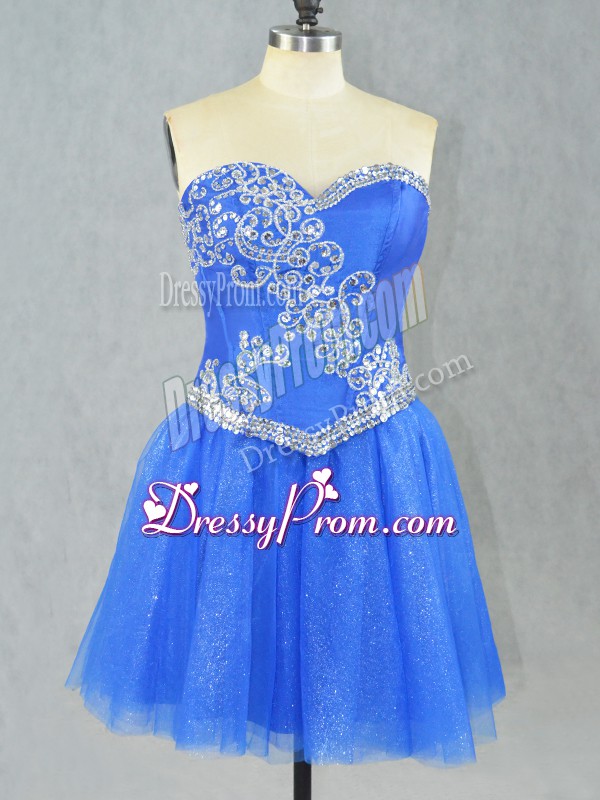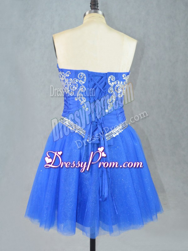 Neckline : SweetheartShown Color : BlueSilhouette : A-lineSleeve Length : sleevelessHemline : mini lengthBack Detail : Lace upFabric : TulleEmbellishment : BeadingOccasion : Prom,PartySeason : Spring,Summer,Fall