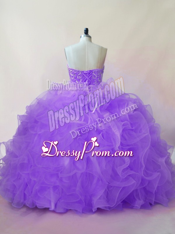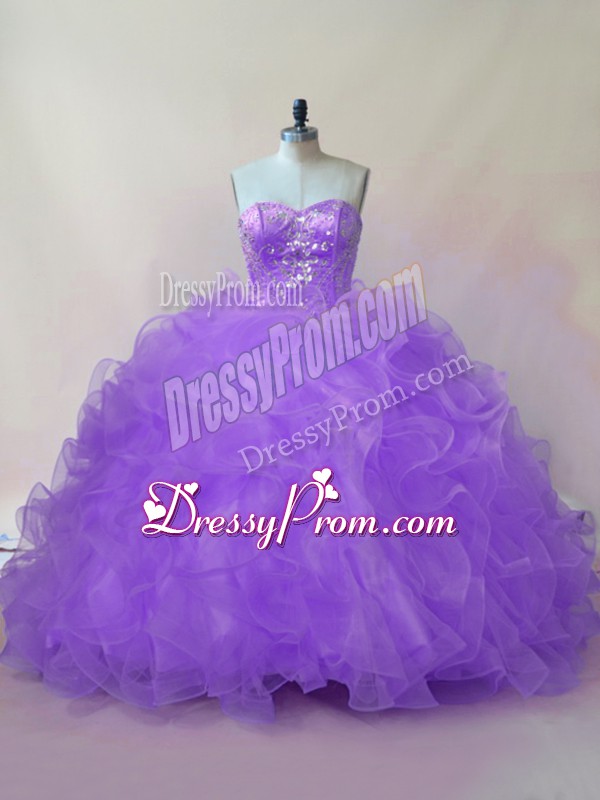 Neckline : SweetheartShown Color : LavenderSilhouette : Ball GownsSleeve Length : sleevelessBack Detail : Lace upFabric : TulleEmbellishment : Beading,RufflesOccasion : Sweet 16,QuinceaneraSeason : Spring,Summer,Fall,Winter