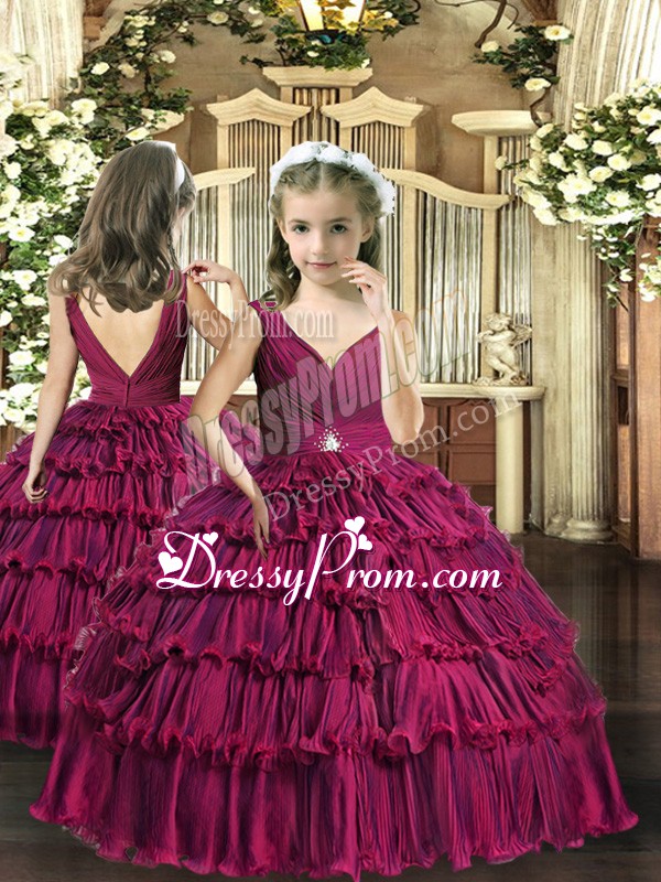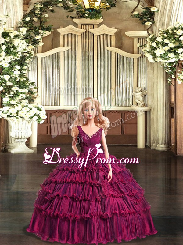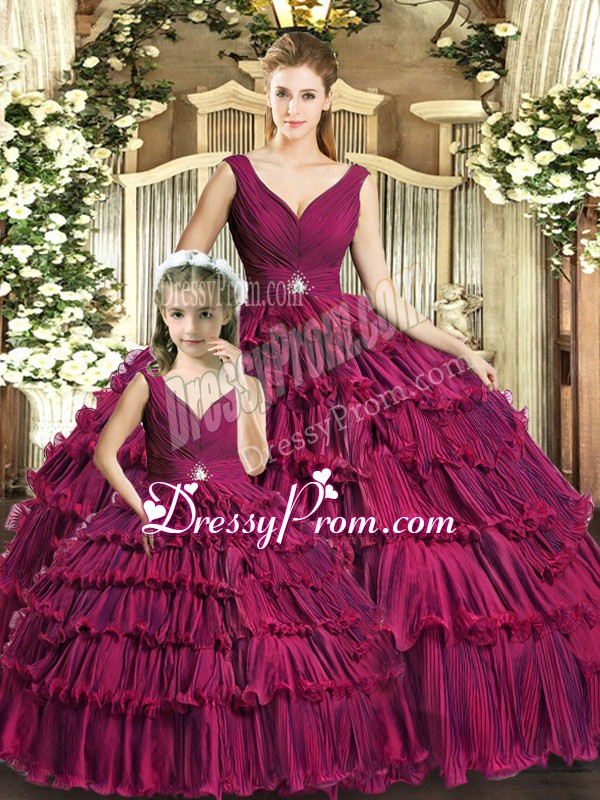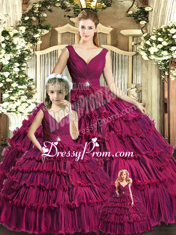 Neckline : V-neckShown Color : BurgundySilhouette : Ball GownsSleeve Length : sleevelessHemline : floor lengthBack Detail : BacklessFabric : OrganzaEmbellishment : Ruffled LayersOccasion : Sweet 16,QuinceaneraSeason : Spring,Summer,Fall,Winter