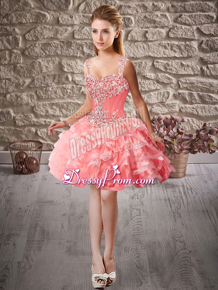 Neckline : StrapsShown Color : Watermelon RedSilhouette : Ball GownsSleeve Length : sleevelessHemline : mini lengthBack Detail : Lace upFabric : OrganzaEmbellishment : Beading,Ruffled LayersOccasion : Prom,PartySeason : Spring,Summer,Fall