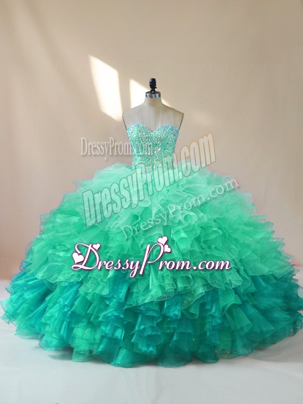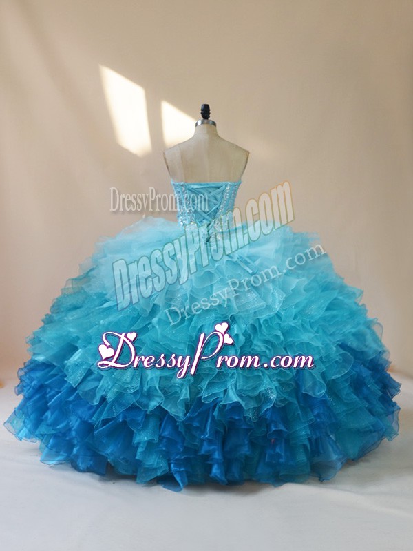 Neckline : SweetheartShown Color : Multi-colorSilhouette : Ball GownsSleeve Length : sleevelessHemline : floor lengthBack Detail : Lace upFabric : OrganzaEmbellishment : Beading,RufflesOccasion : Sweet 16,QuinceaneraSeason : Spring,Summer,Fall,Winter