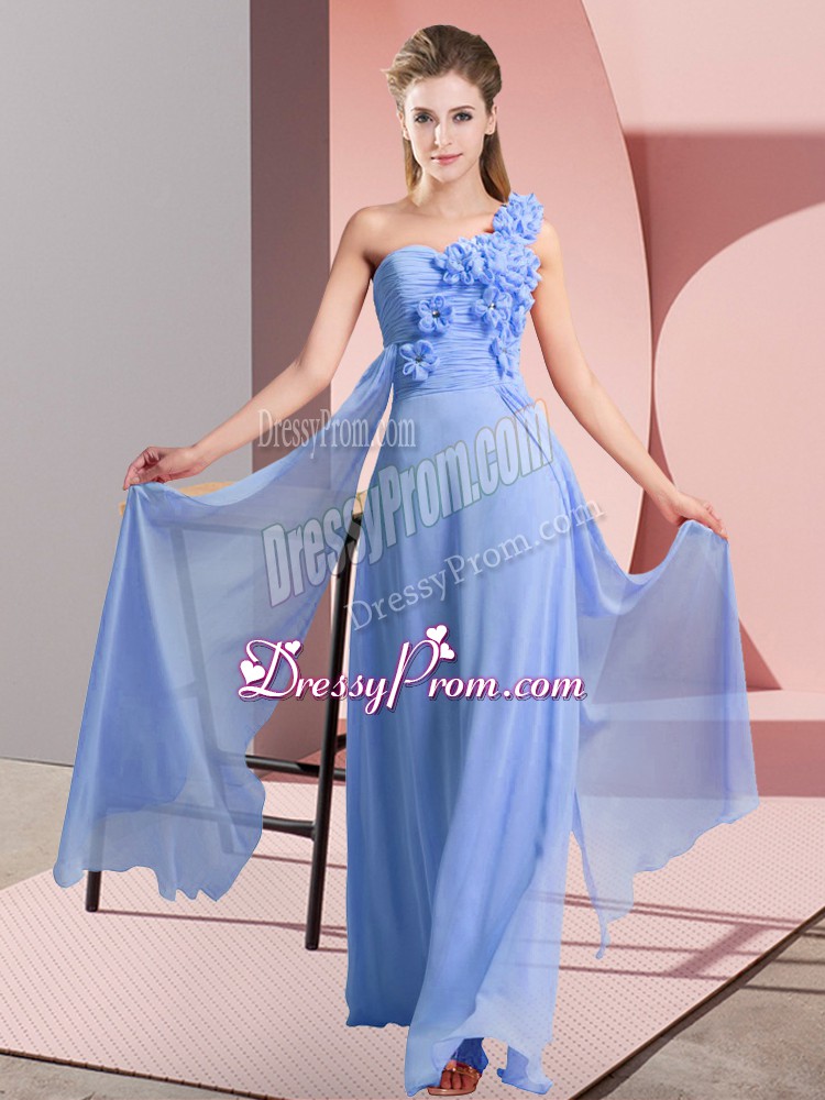 Blue Empire Chiffon One Shoulder Sleeveless Hand Made Flower Floor Length Lace Up Quinceanera Court of Honor Dress