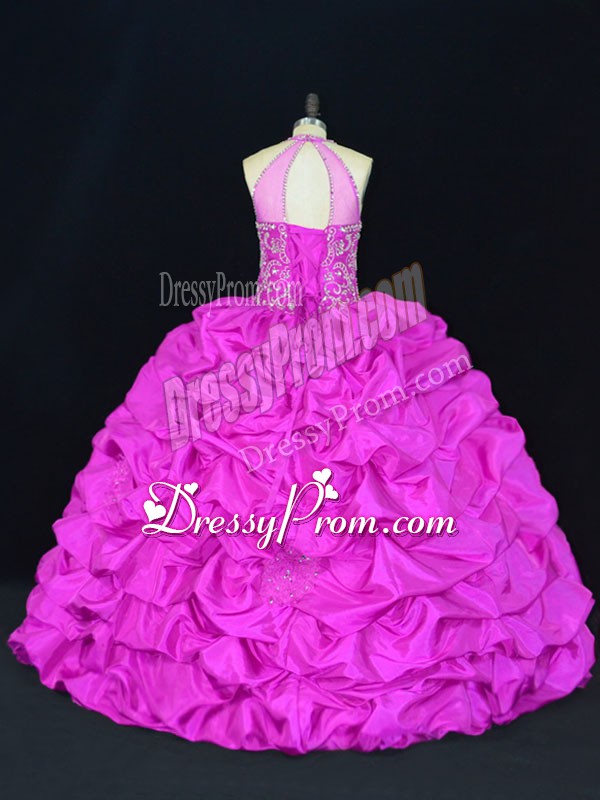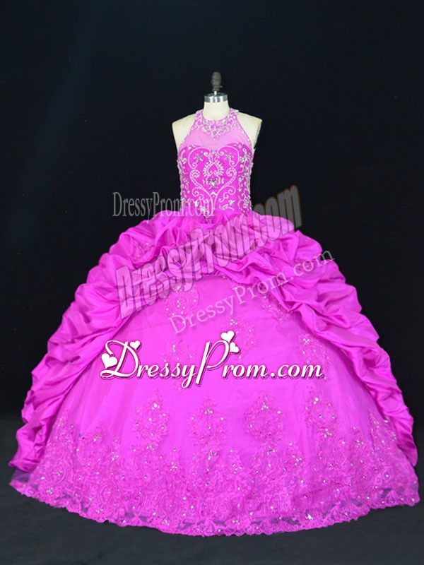 Neckline : Halter topShown Color : FuchsiaSilhouette : Ball GownsSleeve Length : sleevelessHemline : floor lengthBack Detail : Lace upFabric : TaffetaEmbellishment : Beading,Appliques,Pick UpsOccasion : Sweet 16,QuinceaneraSeason : Spring,Summer,Fall,Winter