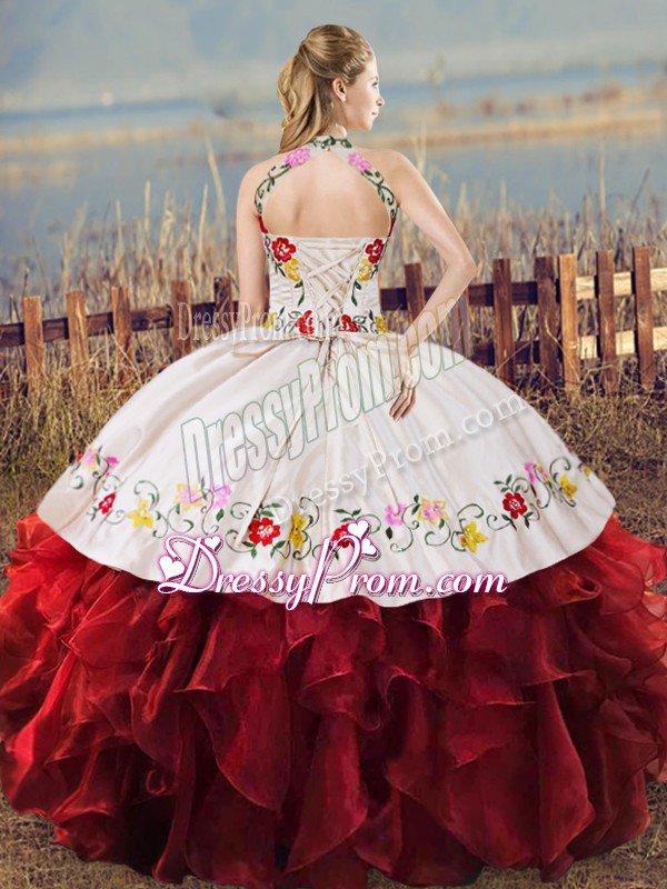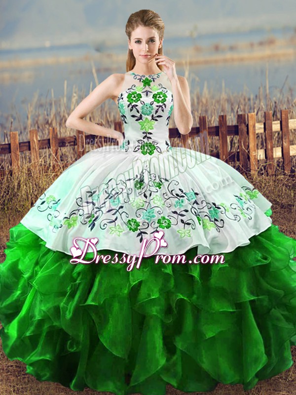 Neckline : Halter topShown Color : Spring GreenSilhouette : Ball GownsSleeve Length : sleevelessHemline : floor lengthBack Detail : Lace upFabric : OrganzaEmbellishment : Embroidery,RufflesOccasion : Sweet 16,QuinceaneraSeason : Spring,Summer,Fall,Winter
