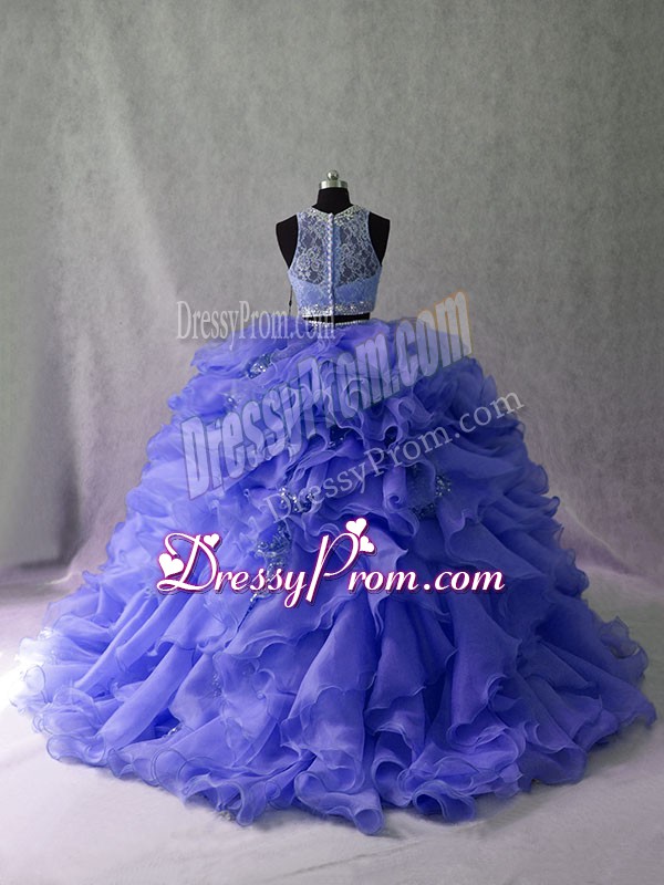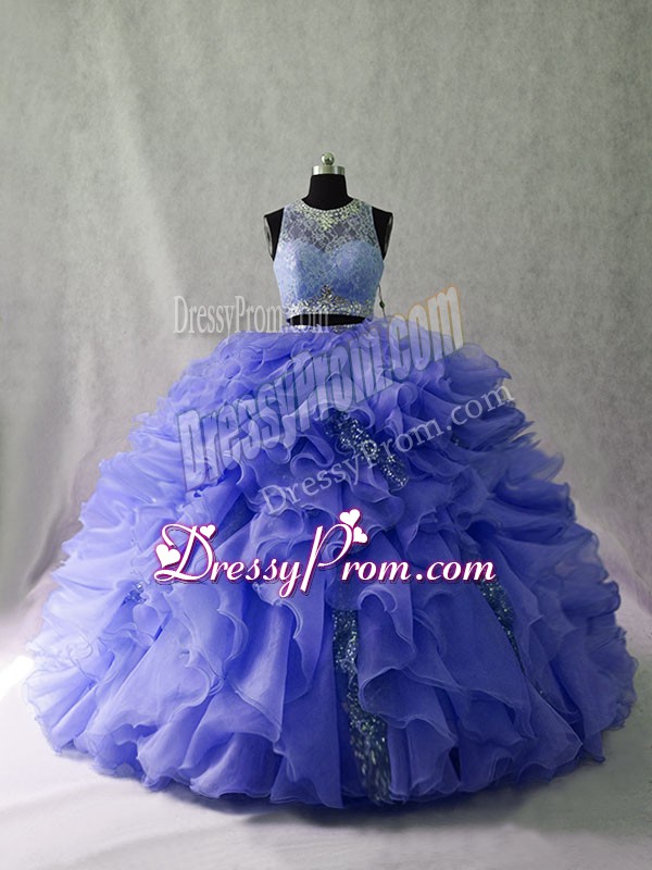 Neckline : ScoopShown Color : LavenderSilhouette : Two PiecesSleeve Length : sleevelessBack Detail : ZipperFabric : OrganzaEmbellishment : Ruffles,SequinsOccasion : Sweet 16,QuinceaneraSeason : Spring,Summer,Fall,Winter