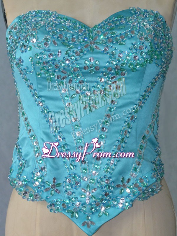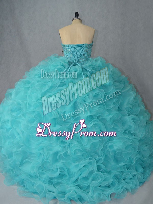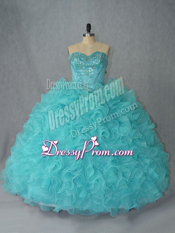 Neckline : SweetheartShown Color : Aqua BlueSilhouette : Ball GownsSleeve Length : sleevelessBack Detail : Lace upFabric : OrganzaEmbellishment : Beading,RufflesOccasion : Sweet 16,QuinceaneraSeason : Spring,Summer,Fall,Winter