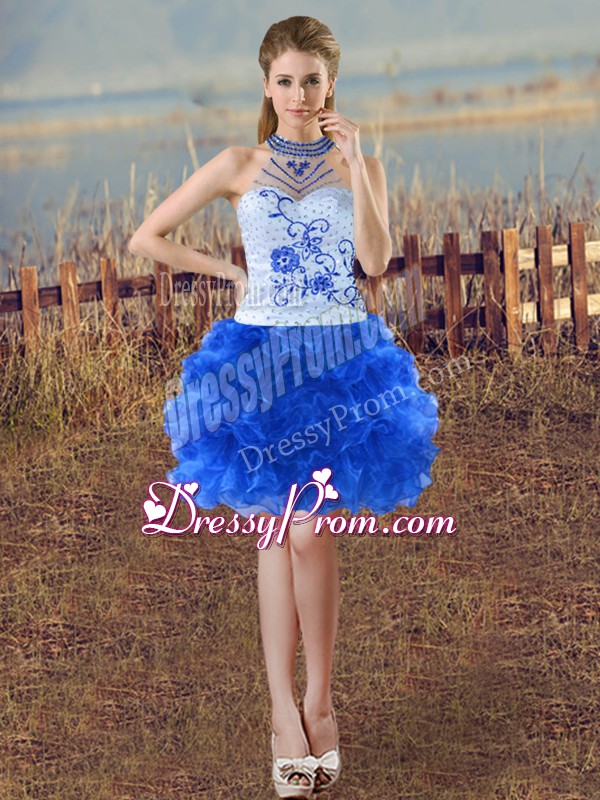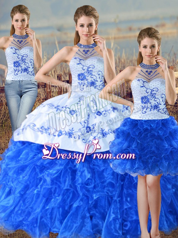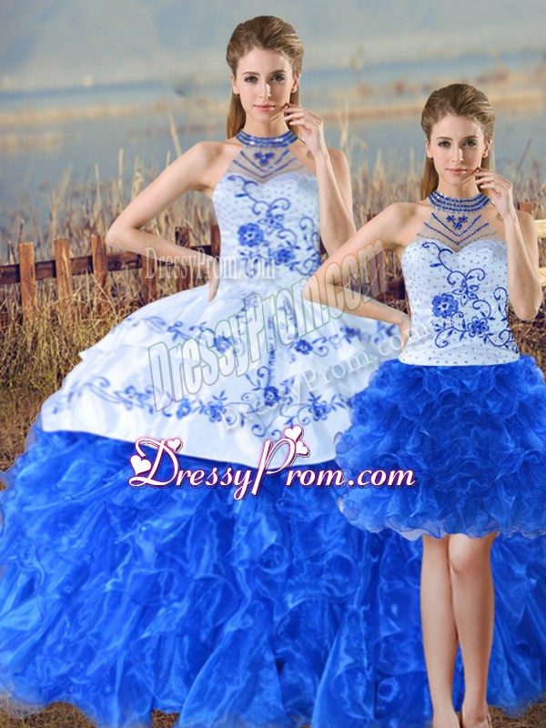 Neckline : Halter top Shown Color : Blue And White Silhouette : Three Pieces Sleeve Length : sleeveless Hemline : floor length Back Detail : Lace up Fabric : Organza Embellishment : Embroidery,Ruffles Occasion : Sweet 16,Quinceanera Season : Spring,Summer,Fall,Winter