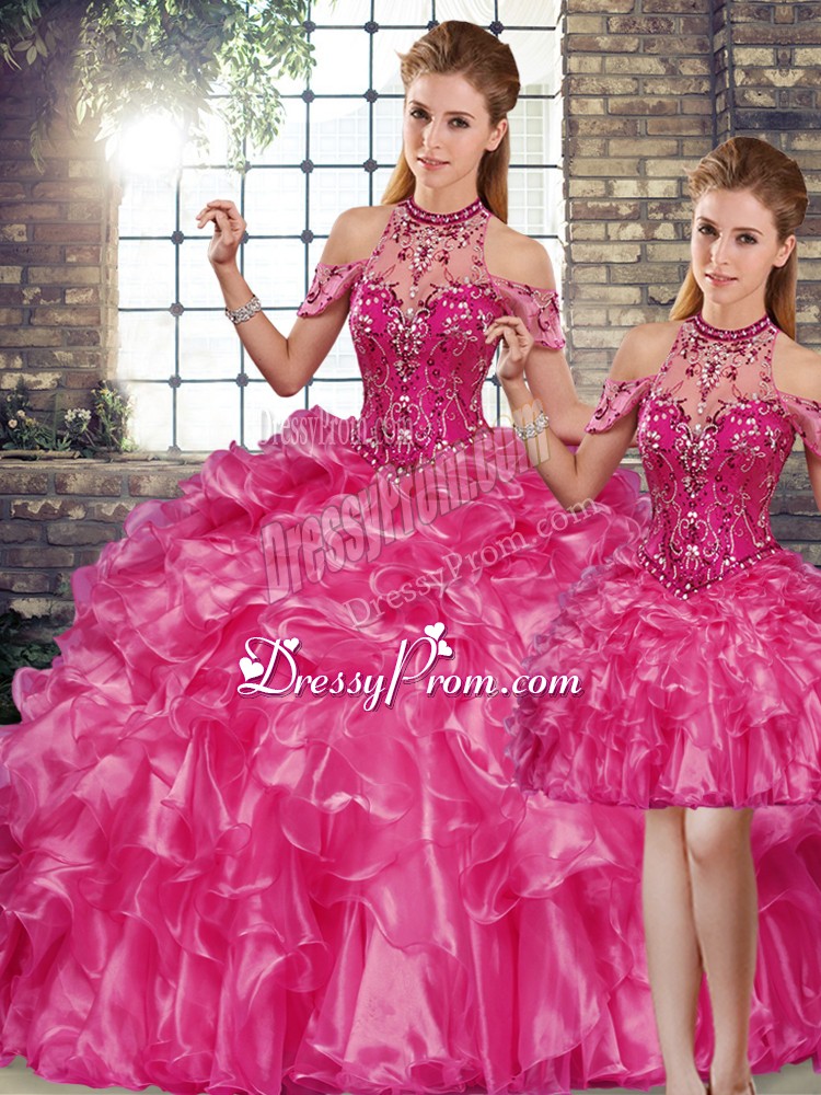 Neckline : Halter topShown Color : FuchsiaSilhouette : Three PiecesSleeve Length : sleevelessHemline : floor lengthBack Detail : Lace upFabric : OrganzaEmbellishment : Beading,RufflesOccasion : Military Ball,Sweet 16,QuinceaneraSeason : Spring,Summer,Fall,Winter