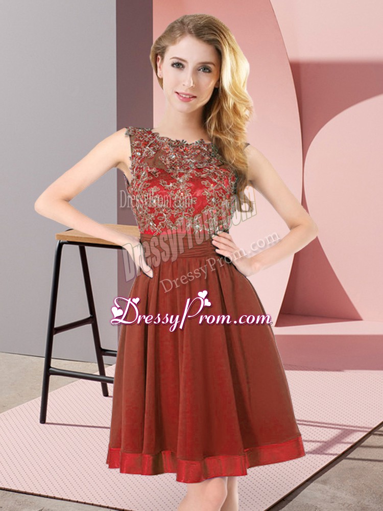 Neckline : ScoopShown Color : Rust RedSilhouette : EmpireSleeve Length : sleevelessHemline : mini lengthBack Detail : BacklessFabric : ChiffonEmbellishment : Beading,AppliquesOccasion : Wedding PartySeason : Spring,Summer,Fall