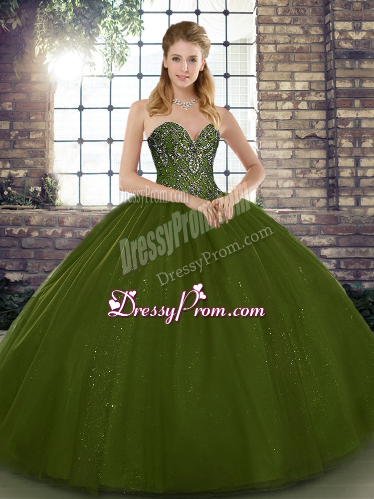 Neckline : SweetheartShown Color : Olive GreenSilhouette : Ball GownsSleeve Length : sleevelessHemline : floor lengthBack Detail : Lace upFabric : TulleEmbellishment : BeadingOccasion : Military Ball,Sweet 16,QuinceaneraSeason : Spring,Summer,Fall,Winter