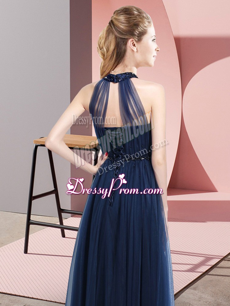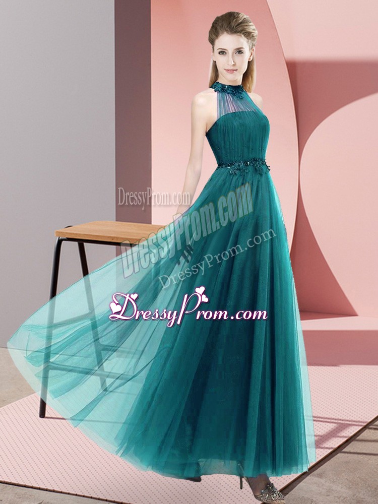 Neckline : Halter topShown Color : Teal Silhouette : EmpireSleeve Length : sleevelessHemline : floor lengthBack Detail : Lace upFabric : TulleEmbellishment : Beading,AppliquesOccasion : Wedding PartySeason : Spring,Summer,Fall,Winter