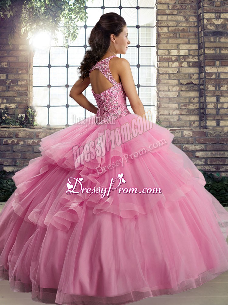 Neckline : ScoopShown Color : LavenderSilhouette : Ball GownsSleeve Length : sleevelessHemline : floor lengthBack Detail : Lace upFabric : TulleEmbellishment : Lace,Embroidery,RufflesOccasion : Military Ball,Sweet 16,QuinceaneraSeason : Spring,Summer,Fall,Winter