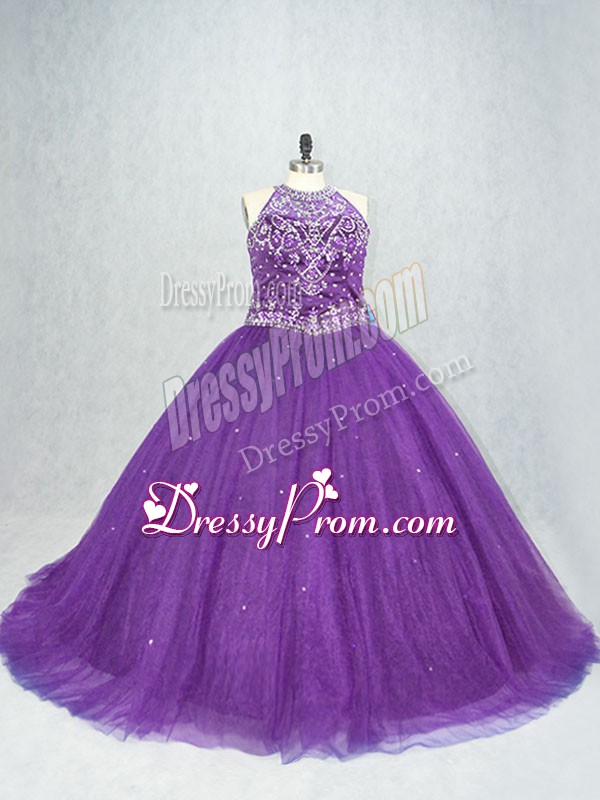 Neckline : ScoopShown Color : PurpleSilhouette : Ball GownsSleeve Length : sleevelessBack Detail : Lace upFabric : TulleEmbellishment : BeadingOccasion : Sweet 16,QuinceaneraSeason : Spring,Summer,Fall,Winter
