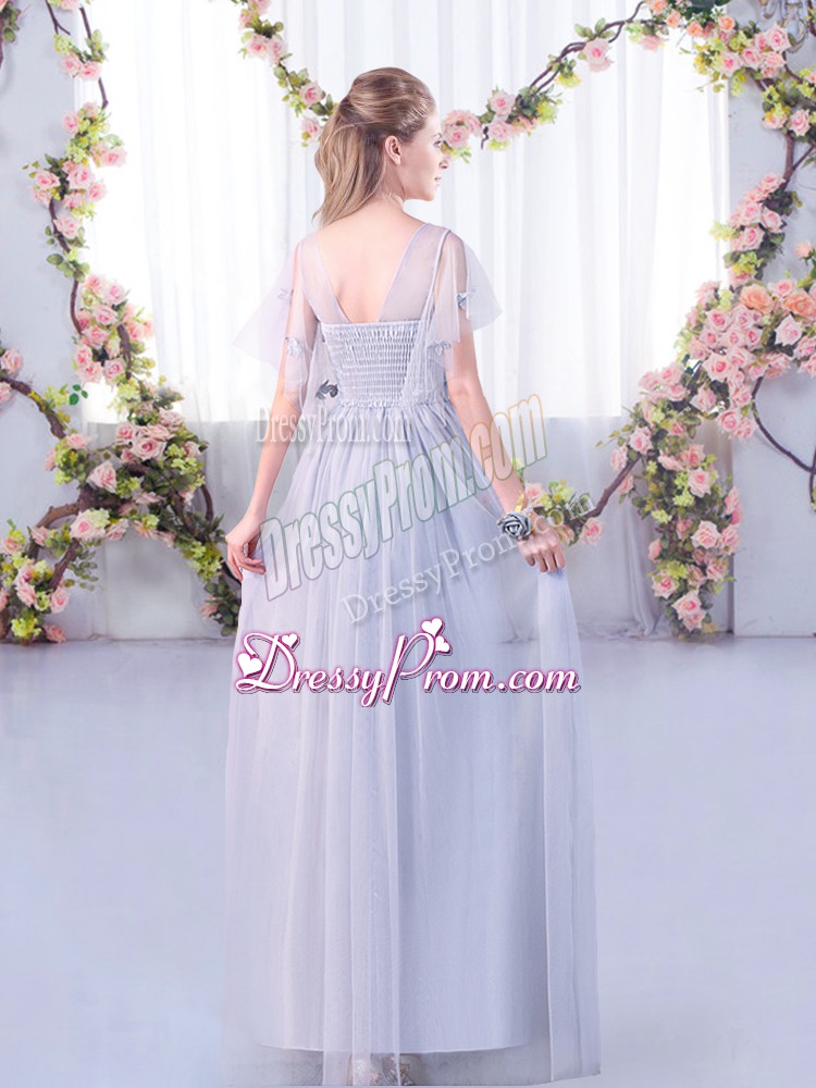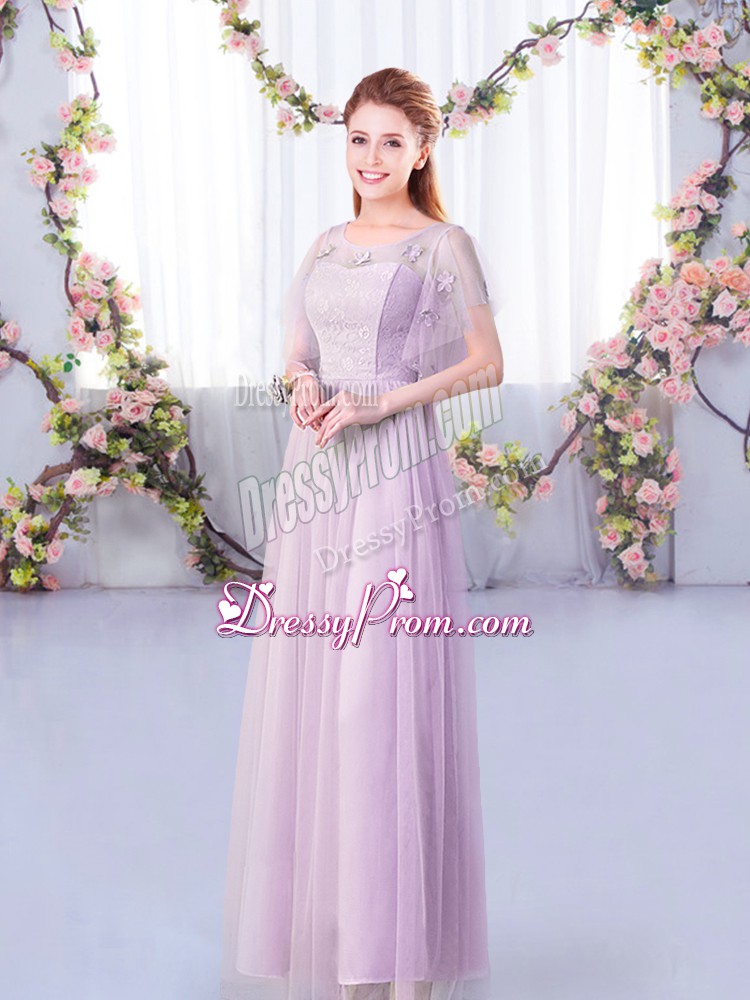 Neckline : ScoopShown Color : LavenderSilhouette : EmpireSleeve Length : short sleevesHemline : floor lengthBack Detail : Side zipperFabric : TulleEmbellishment : Lace,BeltOccasion : Wedding PartySeason : Spring,Summer,Fall,Winter