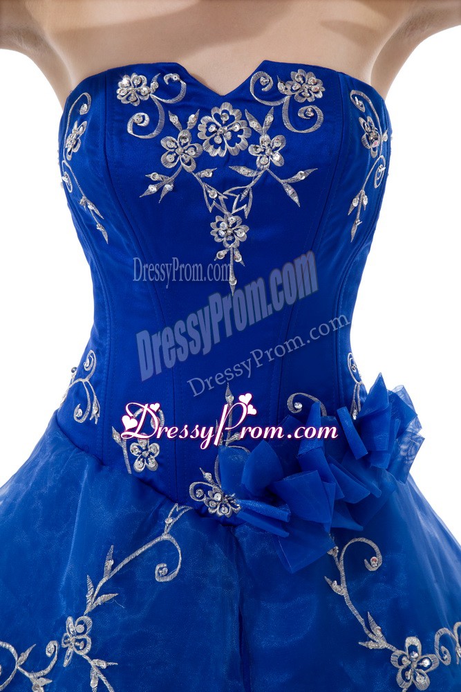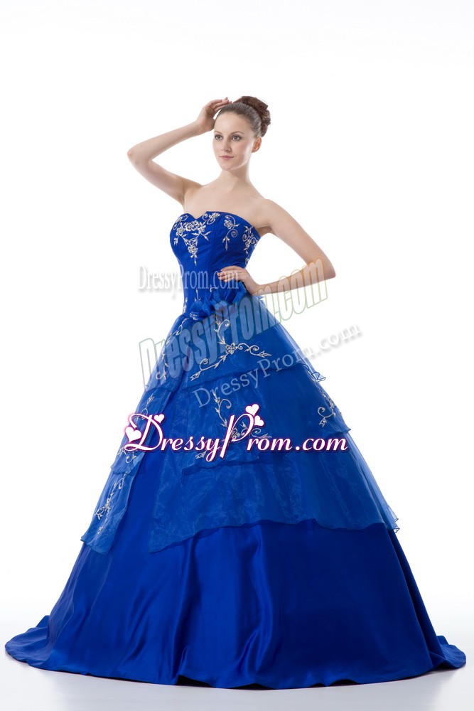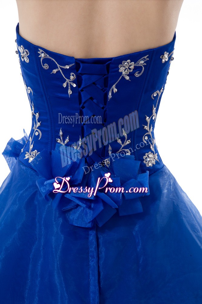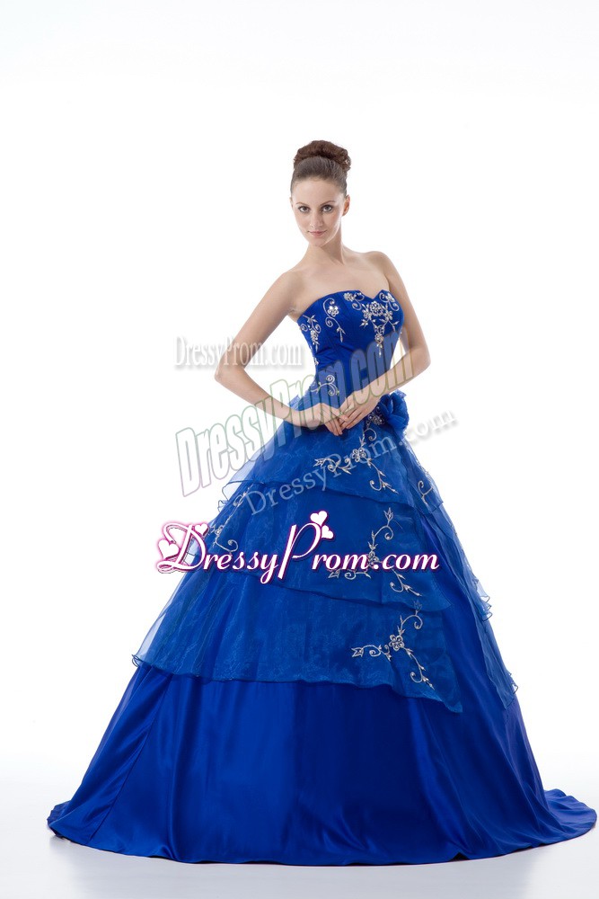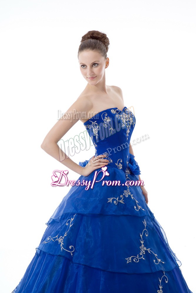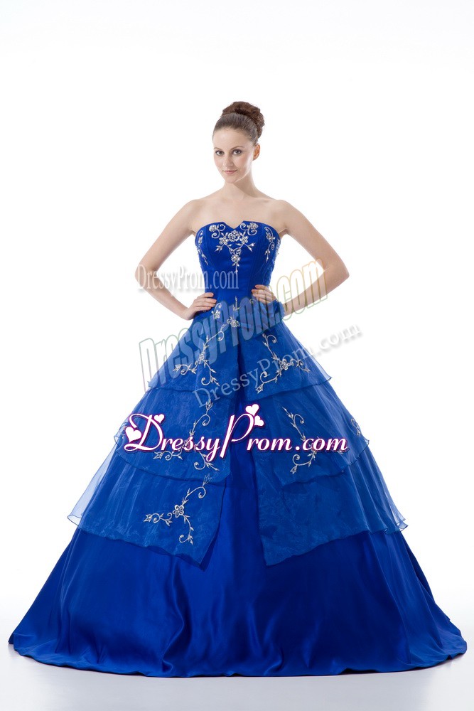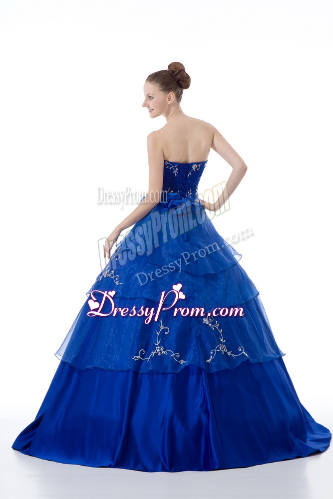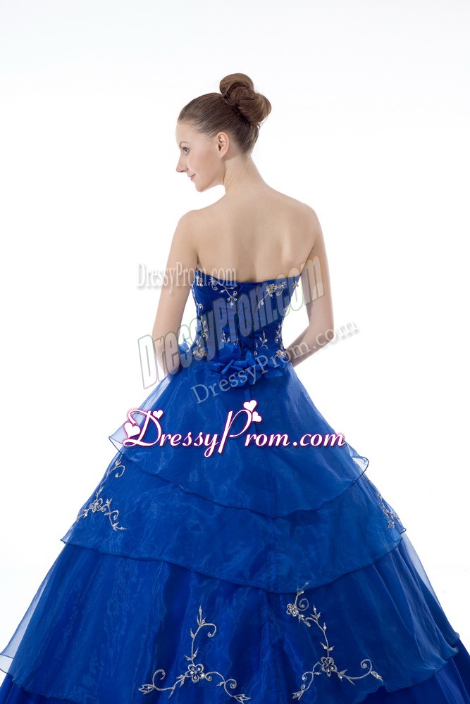 Neckline : V-neckShown Color : Royal BlueSilhouette : Ball GownsSleeve Length : sleevelessHemline : floor lengthBack Detail : Lace upFabric : OrganzaEmbellishment : Embroidery,Ruffled LayersOccasion : Sweet 16,QuinceaneraSeason : Spring,Summer,Fall,Winter