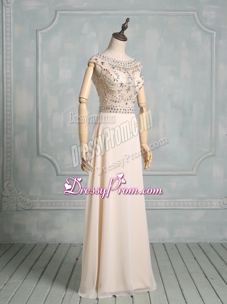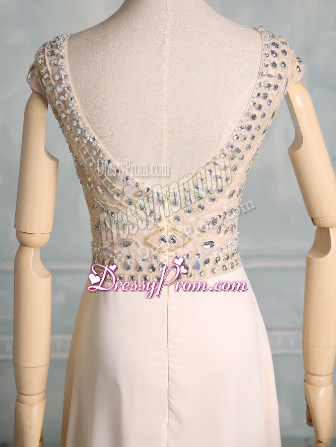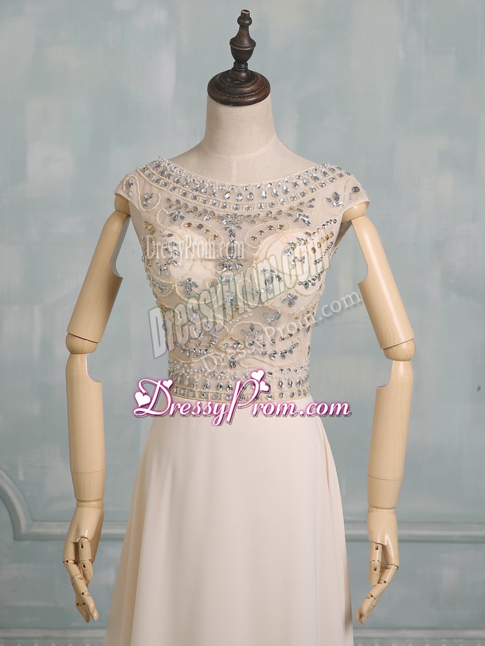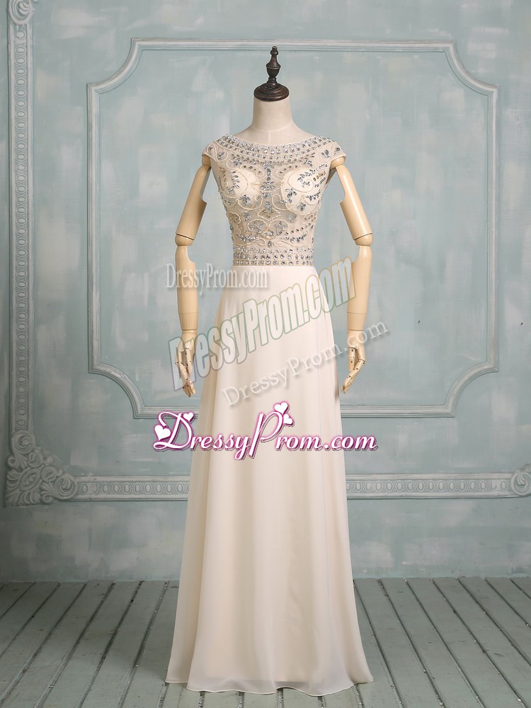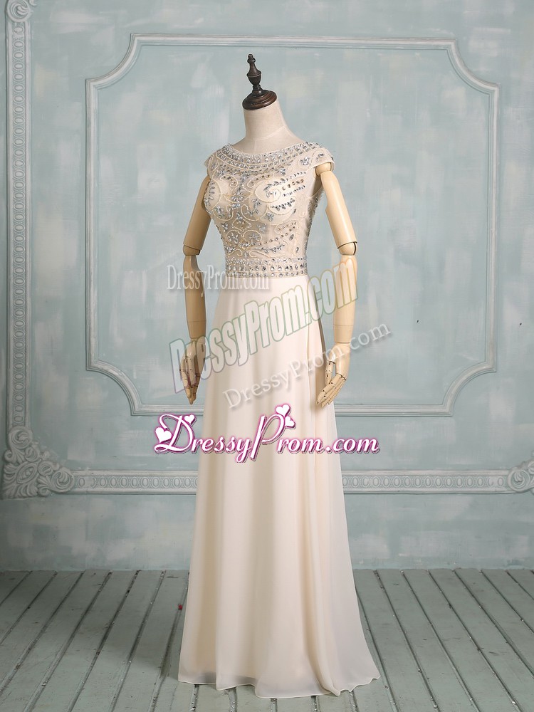 Neckline : ScoopShown Color : ChampagneSilhouette : EmpireSleeve Length : cap sleevesHemline : floor lengthBack Detail : BacklessFabric : ChiffonEmbellishment : BeadingOccasion : Prom,PartySeason : Spring,Summer,Fall,Winter