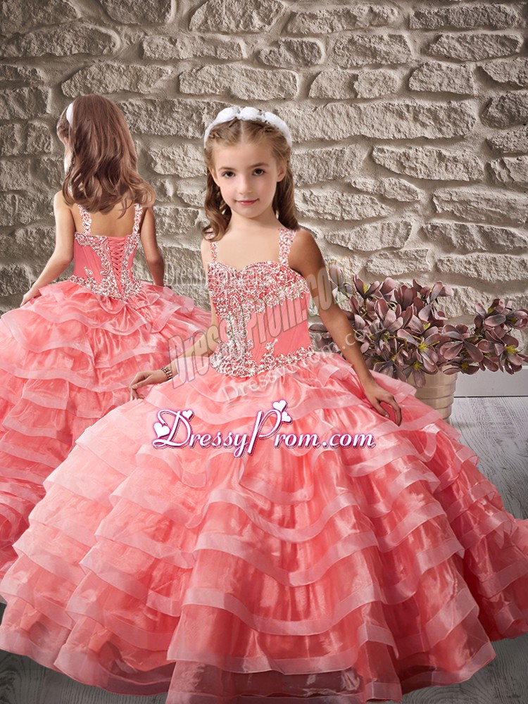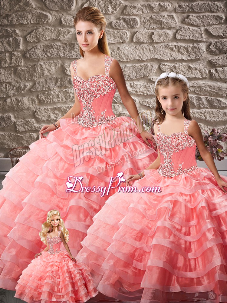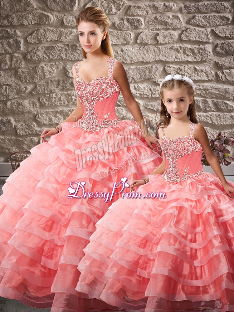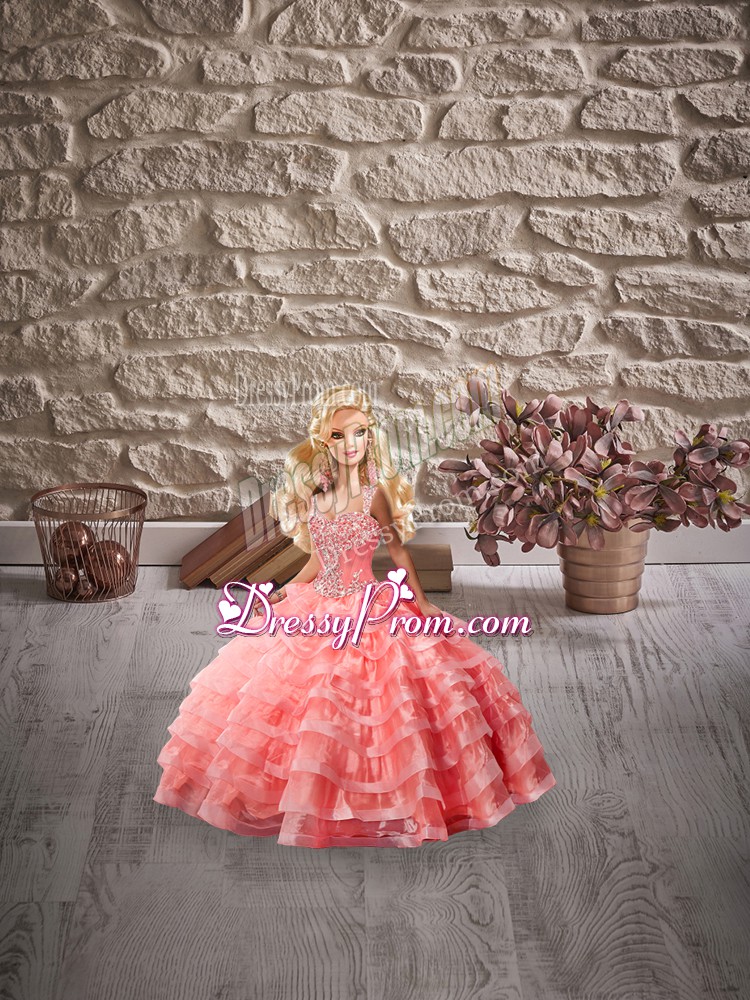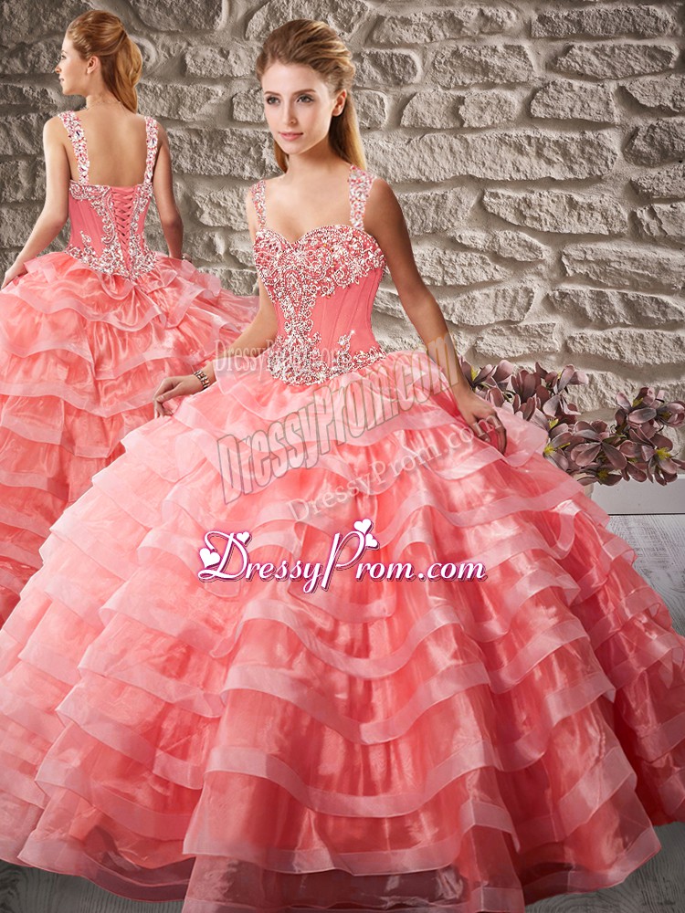 Neckline : StrapsShown Color : Watermelon RedSilhouette : Ball GownsSleeve Length : sleevelessBack Detail : Lace upFabric : OrganzaEmbellishment : Beading,Ruffled LayersOccasion : Sweet 16,QuinceaneraSeason : Spring,Summer,Fall,Winter