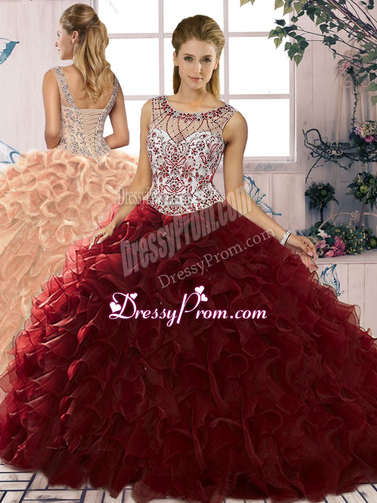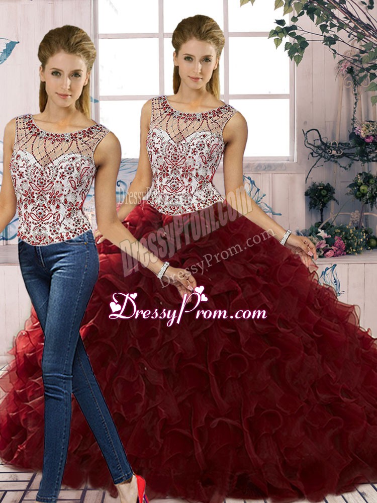 Neckline : ScoopShown Color : BurgundySilhouette : Two PiecesSleeve Length : sleevelessHemline : floor lengthBack Detail : Lace upFabric : OrganzaEmbellishment : Beading,RufflesOccasion : Military Ball,Sweet 16,QuinceaneraSeason : Spring,Summer,Fall,Winter