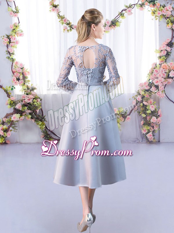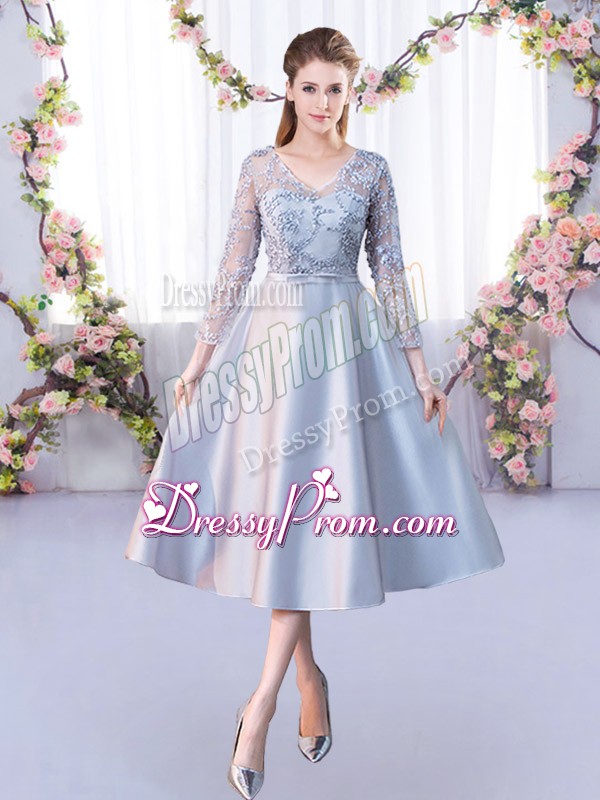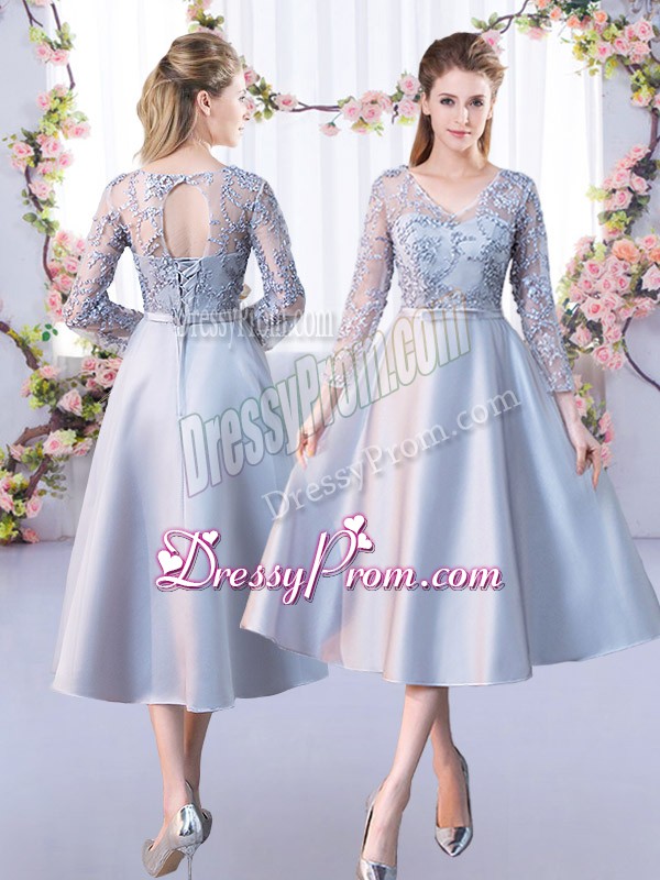 Neckline : V-neckShown Color : SilverSilhouette : A-lineSleeve Length : 3|4 length sleeveHemline : tea lengthBack Detail : Lace upFabric : SatinEmbellishment : LaceOccasion : Prom,Party,Wedding PartySeason : Spring,Summer,Fall,Winter