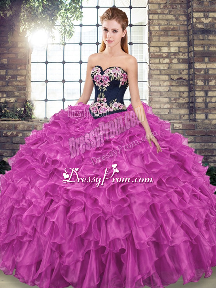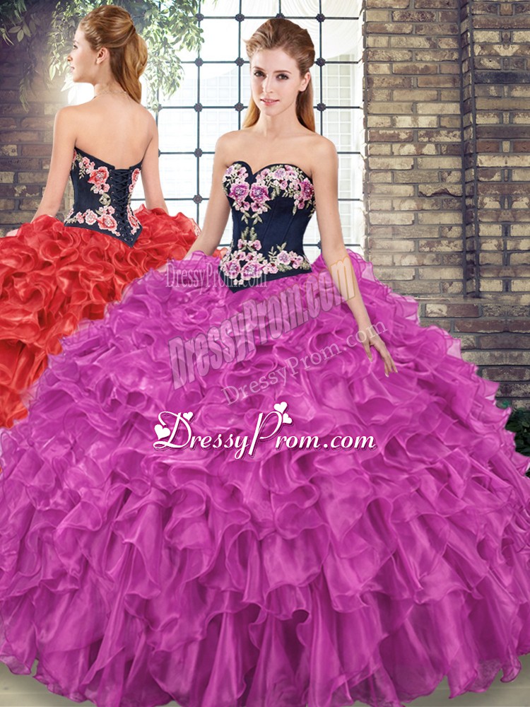 Neckline : SweetheartShown Color : FuchsiaSilhouette : Ball GownsSleeve Length : sleevelessBack Detail : Lace upFabric : OrganzaEmbellishment : Embroidery,RufflesOccasion : Military Ball,Sweet 16,QuinceaneraSeason : Spring,Summer,Fall,Winter