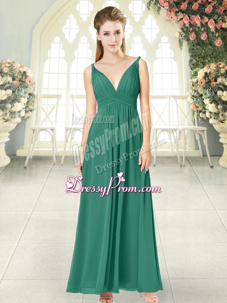 Neckline : V-neckShown Color : GreenSilhouette : EmpireSleeve Length : sleevelessHemline : ankle lengthBack Detail : BacklessFabric : ChiffonEmbellishment : RuchingOccasion : Prom,PartySeason : Spring,Summer,Fall,Winter
