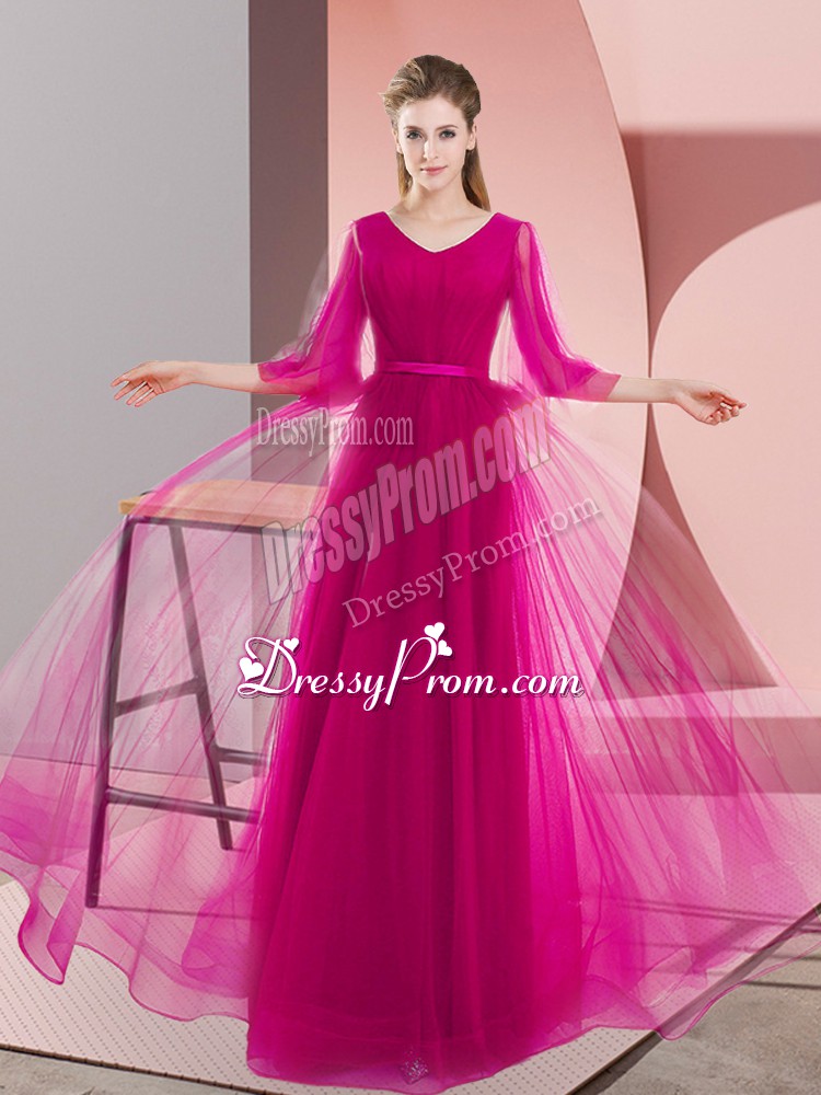 Neckline : V-neckShown Color : Pink ,FuchsiaSilhouette : A-lineSleeve Length : long sleevesHemline : floor lengthBack Detail : ZipperFabric : TulleEmbellishment : BeadingOccasion : Prom,PartySeason : Spring,Summer,Fall,Winter