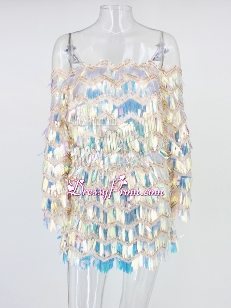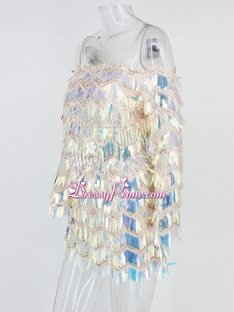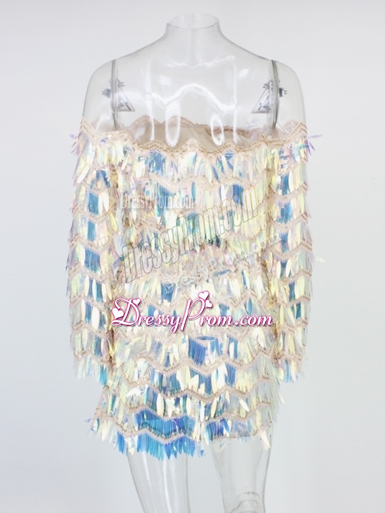 Neckline : Off the shoulderShown Color : SilverSilhouette : A-lineSleeve Length : long sleevesHemline : mini lengthFabric : SequinedEmbellishment : RuchingOccasion : Prom,PartySeason : Spring,Summer,Fall