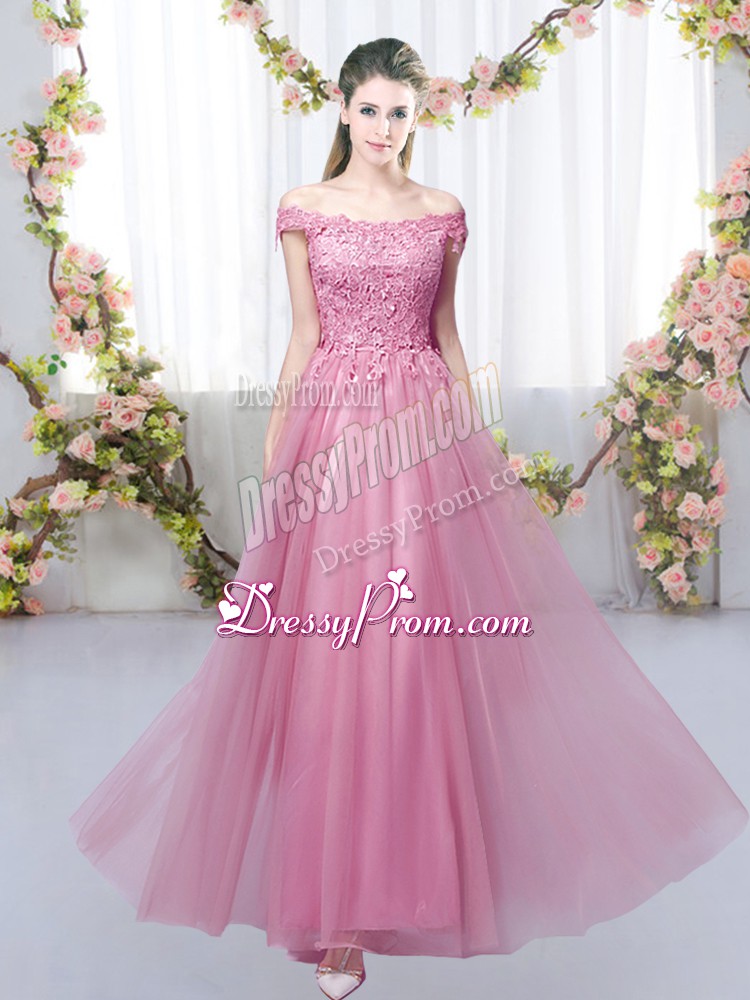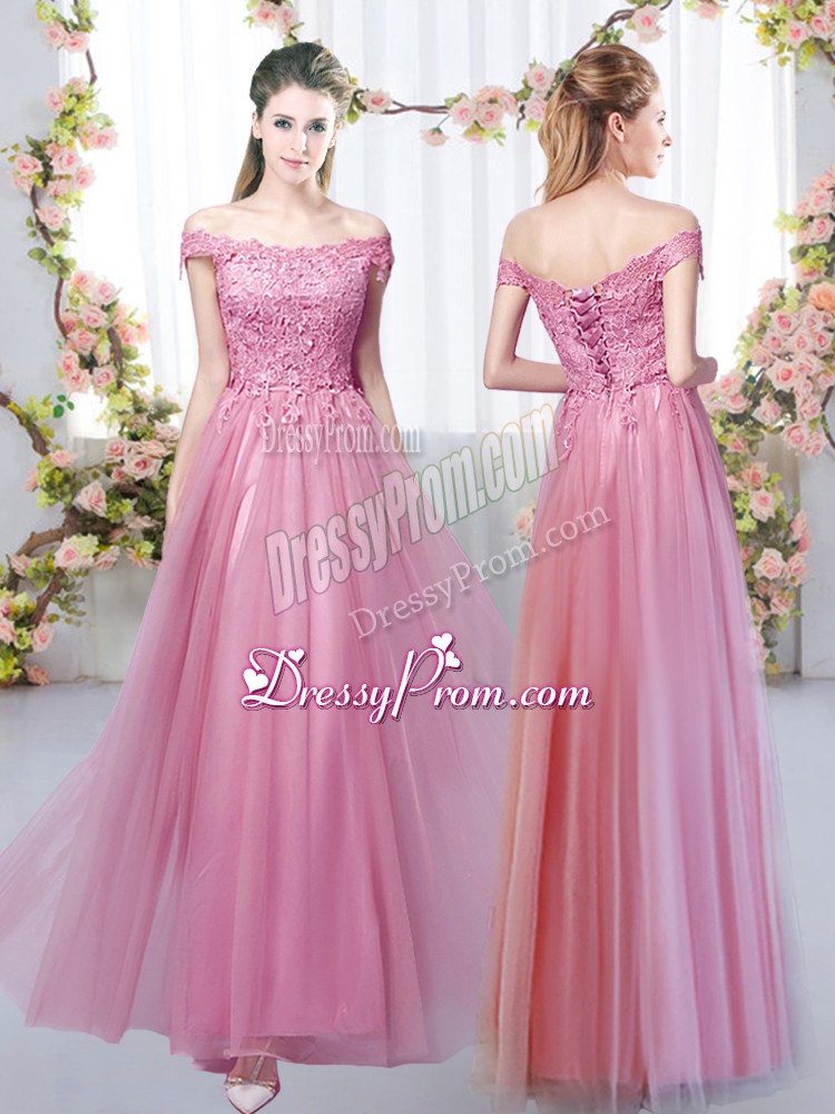 Neckline : Off the shoulderShown Color : Pink Silhouette : EmpireSleeve Length : sleevelessHemline : floor lengthBack Detail : Lace upFabric : TulleEmbellishment : LaceOccasion : Prom,Party,Wedding PartySeason : Spring,Summer,Fall,Winter