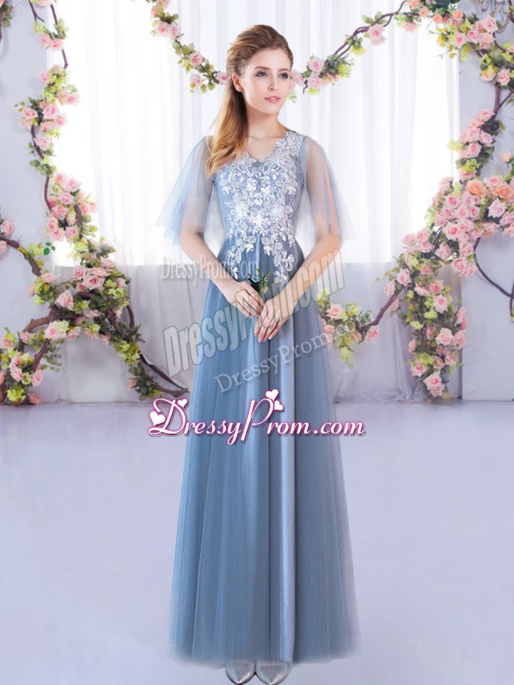 Neckline : V-neckShown Color : BlueSilhouette : A-lineSleeve Length : half sleevesHemline : floor lengthBack Detail : Lace upFabric : TulleEmbellishment : LaceOccasion : Prom,Party,Wedding PartySeason : Spring,Summer,Fall,Winter