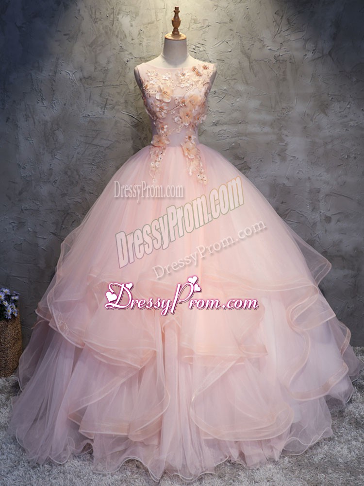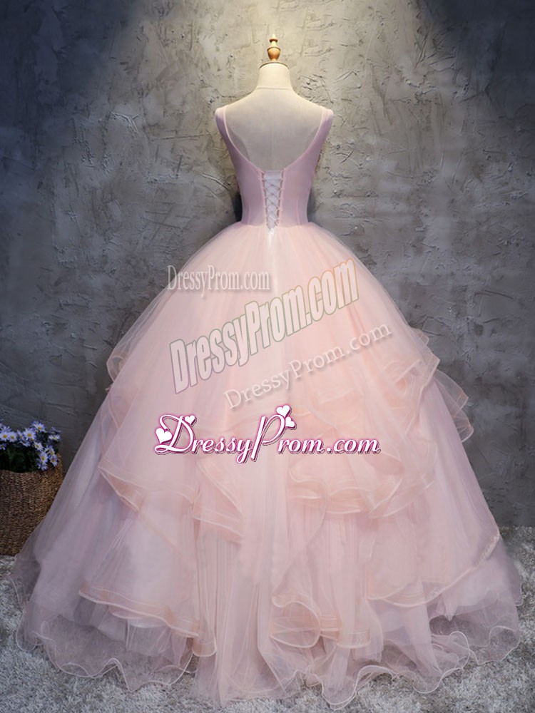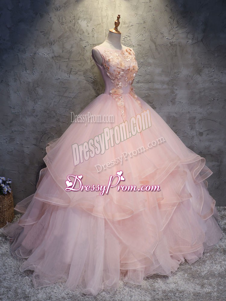 Neckline : ScoopShown Color : Pink Silhouette : Ball GownsSleeve Length : sleevelessHemline : floor lengthBack Detail : Lace upFabric : TulleEmbellishment : Appliques,RufflesOccasion : Military Ball,Sweet 16,QuinceaneraSeason : Spring,Summer,Fall,Winter