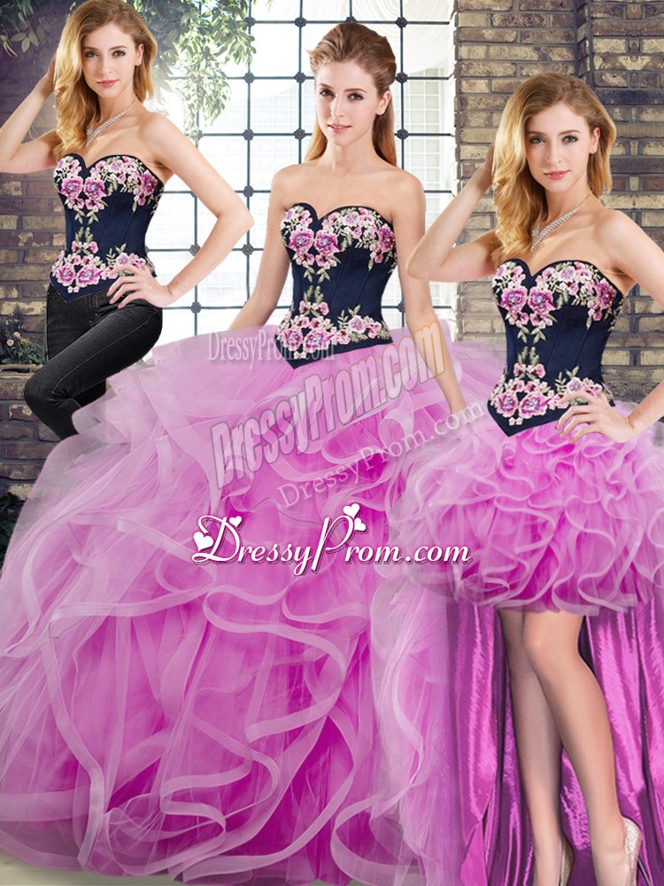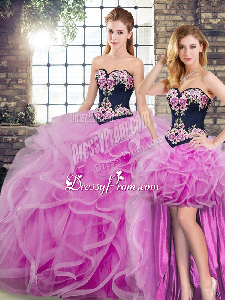 Neckline : SweetheartShown Color : LilacSilhouette : Ball GownsSleeve Length : sleevelessBack Detail : Lace upFabric : TulleEmbellishment : Embroidery,RufflesOccasion : Military Ball,Sweet 16,QuinceaneraSeason : Spring,Summer,Fall,Winter