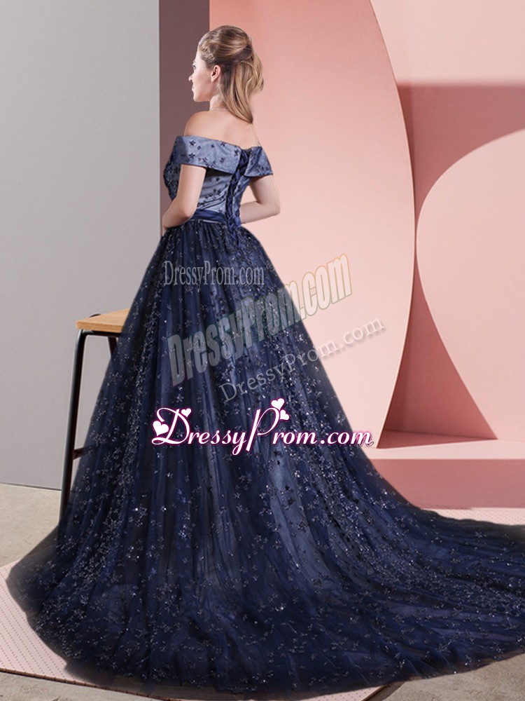 Neckline : Off the shoulder Shown Color : Navy Blue Silhouette : Ball Gowns Sleeve Length : sleeveless Back Detail : Lace up Fabric : Tulle Embellishment : Beading Occasion : Prom,Party,Military Ball Season : Spring,Summer,Fall,Winter