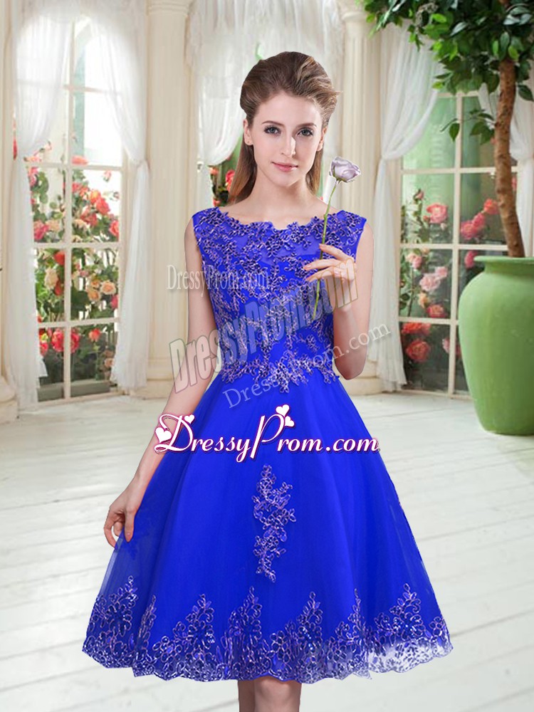 Neckline : ScoopShown Color : Royal BlueSilhouette : A-lineSleeve Length : sleevelessHemline : knee lengthBack Detail : Lace upFabric : TulleEmbellishment : Beading,AppliquesOccasion : Prom,PartySeason : Spring,Summer,Fall