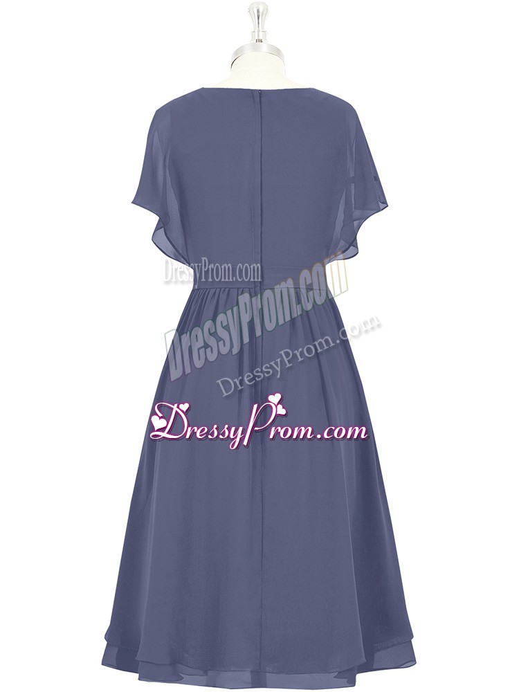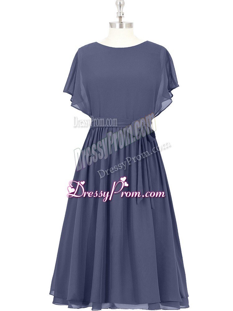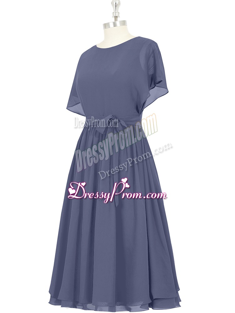 Neckline : ScoopShown Color : BlueSilhouette : A-lineSleeve Length : short sleevesHemline : knee lengthBack Detail : ZipperFabric : ChiffonEmbellishment : BowknotOccasion : Prom,Party,Military BallSeason : Spring,Summer,Fall