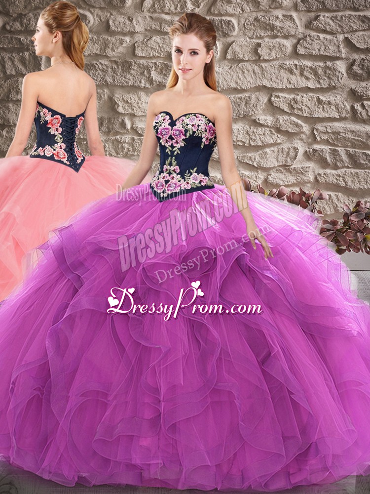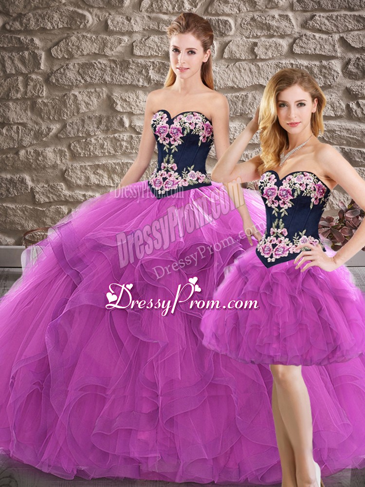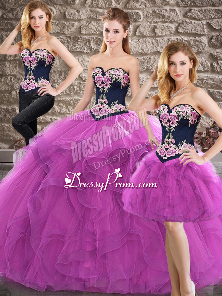 Neckline : SweetheartShown Color : PurpleSilhouette : Three PiecesSleeve Length : sleevelessHemline : floor lengthBack Detail : Lace upFabric : TulleEmbellishment : Beading,EmbroideryOccasion : Sweet 16,QuinceaneraSeason : Spring,Summer,Fall,Winter