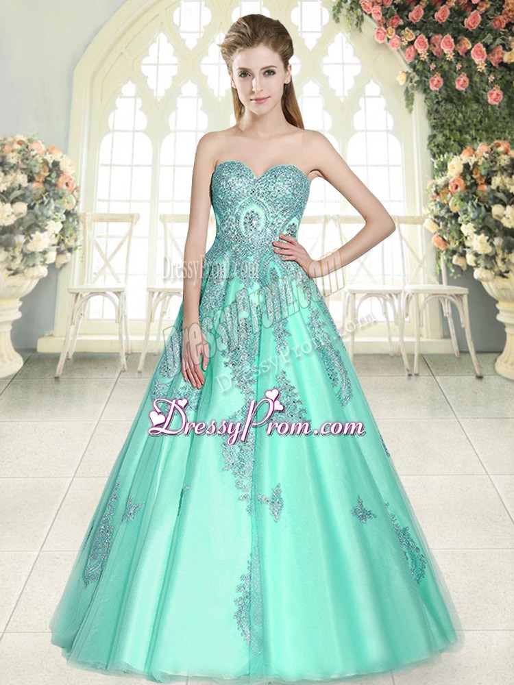 Neckline : SweetheartShown Color : Apple GreenSilhouette : A-lineSleeve Length : sleevelessHemline : floor lengthBack Detail : Lace upFabric : TulleEmbellishment : AppliquesOccasion : Prom,PartySeason : Spring,Summer,Fall,Winter
