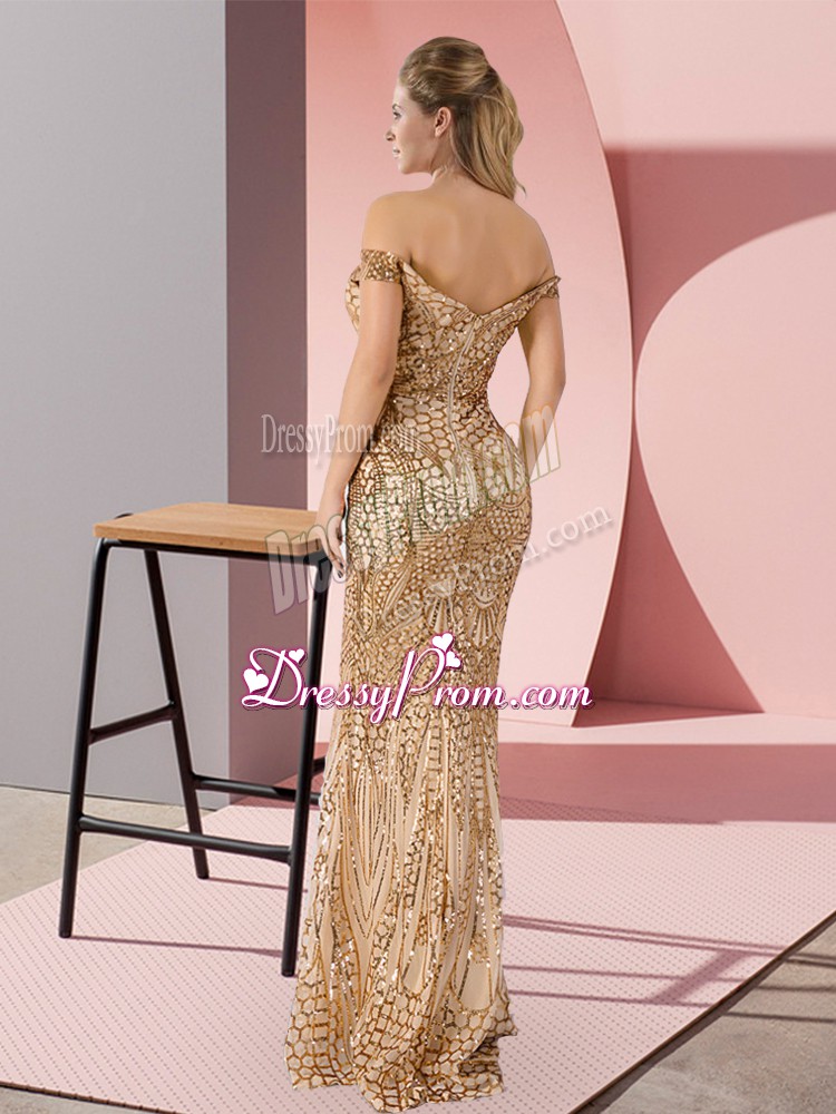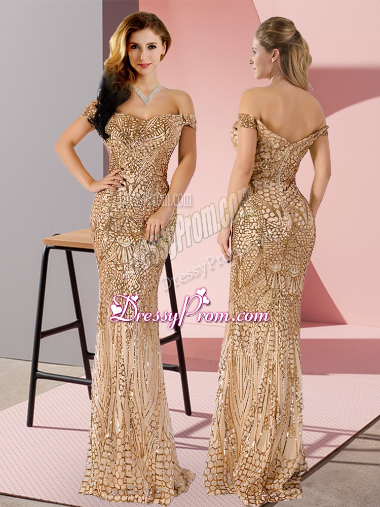 Neckline : Off the shoulderShown Color : GoldSilhouette : MermaidSleeve Length : sleevelessHemline : floor lengthBack Detail : ZipperFabric : SequinedEmbellishment : RuchingOccasion : Prom,PartySeason : Spring,Summer,Fall,Winter