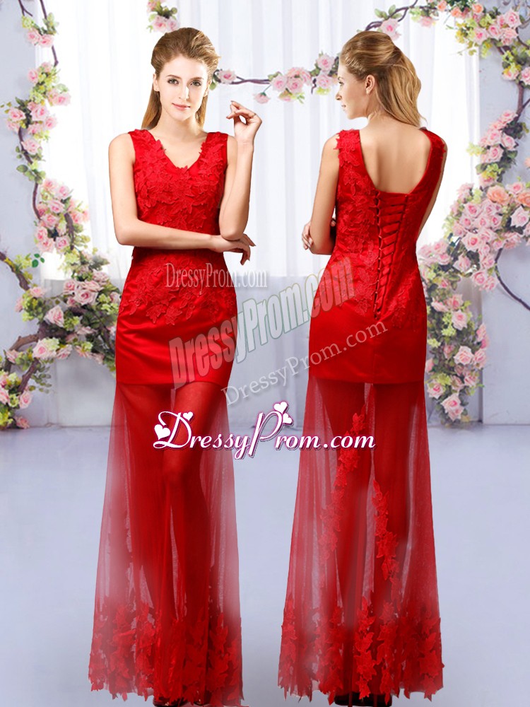 Red Sleeveless Floor Length Lace Lace Up Dama Dress