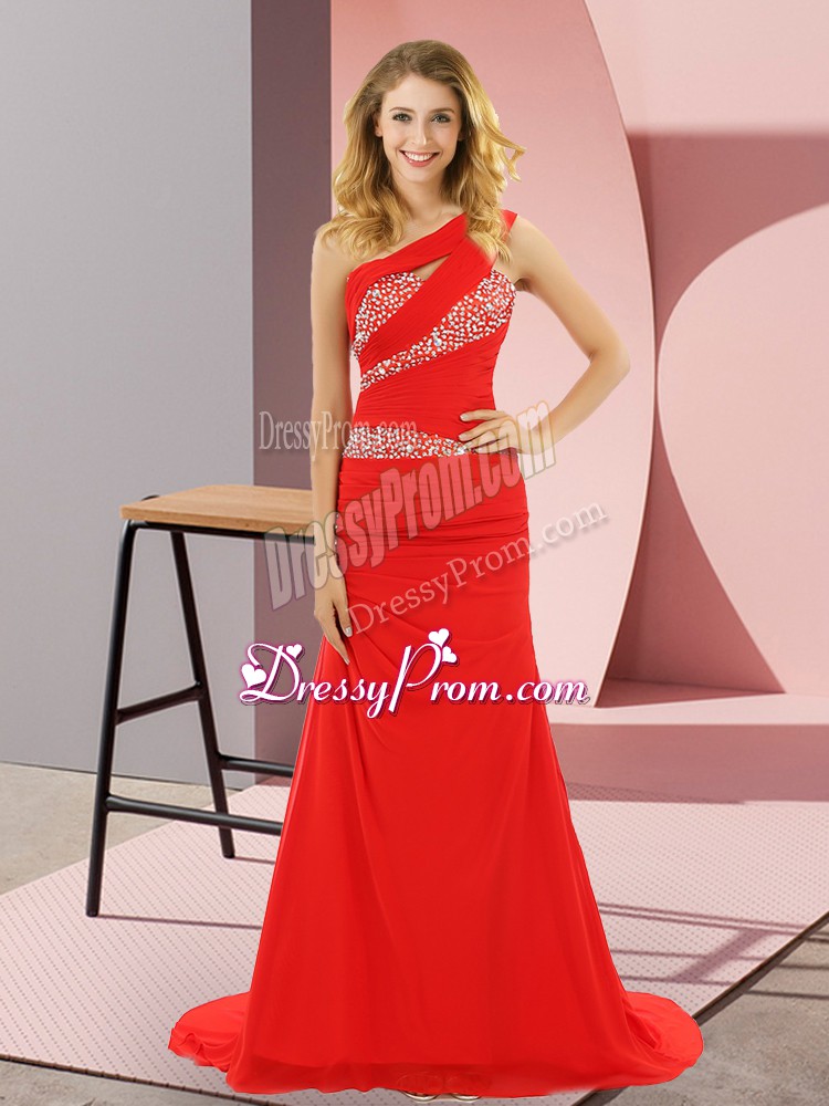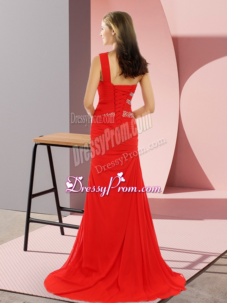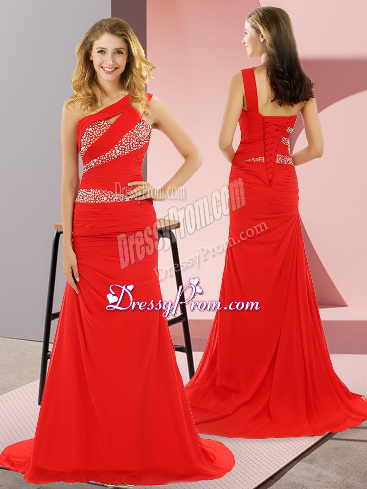 Neckline : One shoulderShown Color : RedSilhouette : Column/SheathSleeve Length : sleevelessBack Detail : Lace upFabric : ChiffonEmbellishment : BeadingOccasion : Prom,Party,Military BallSeason : Spring,Summer,Fall,Winter