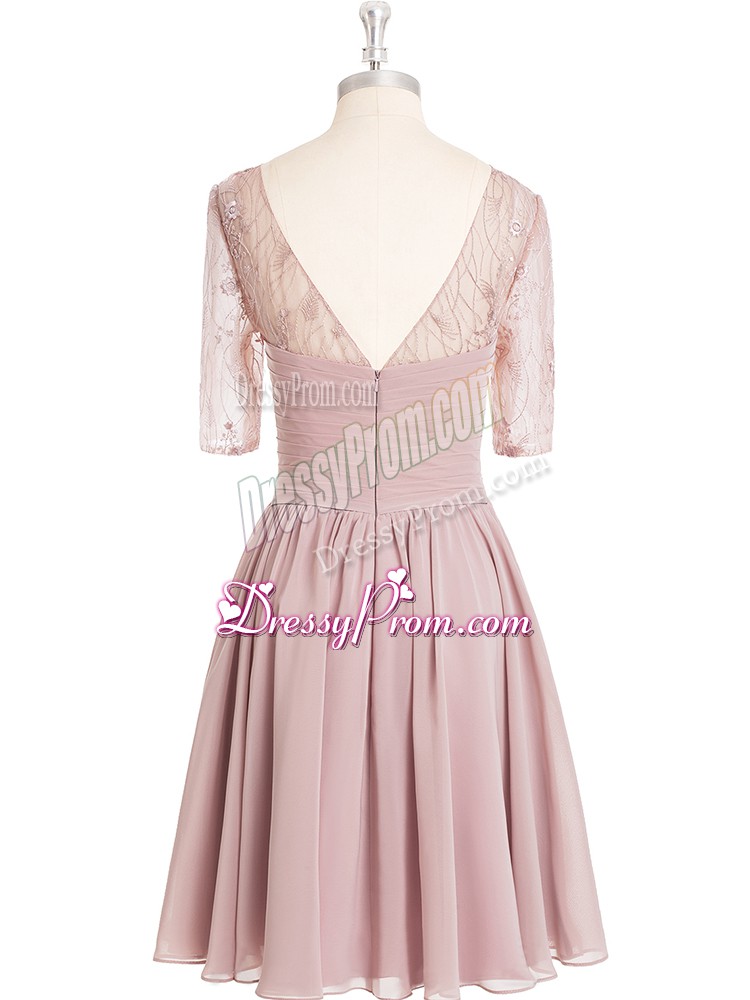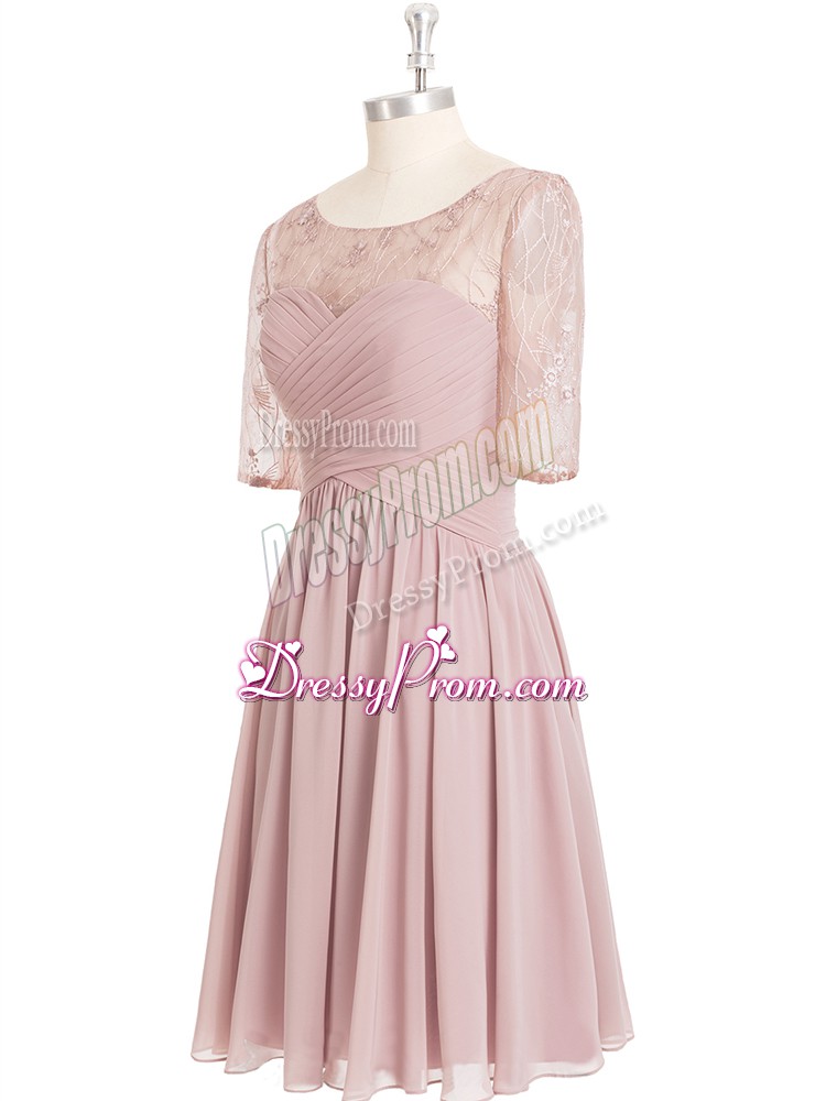 Neckline : ScoopShown Color : Pink Silhouette : A-lineSleeve Length : half sleevesHemline : knee lengthBack Detail : ZipperFabric : ChiffonEmbellishment : Lace,RuchingOccasion : Prom,Party,Military BallSeason : Spring,Summer,Fall