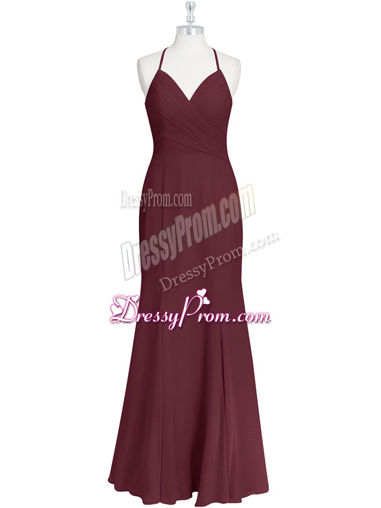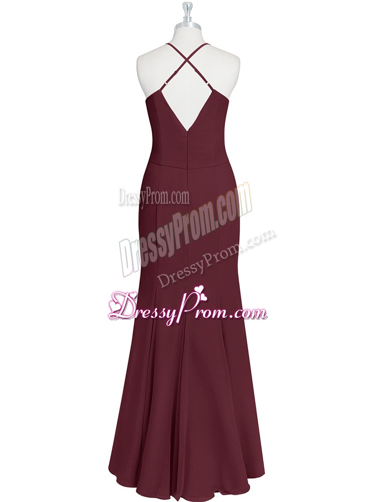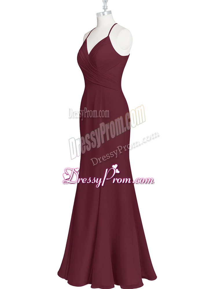 Neckline : Spaghetti strapsShown Color : BurgundySilhouette : MermaidSleeve Length : sleevelessHemline : floor lengthBack Detail : Criss crossFabric : ChiffonEmbellishment : RuchingOccasion : Prom,Party,Military BallSeason : Spring,Summer,Fall,Winter