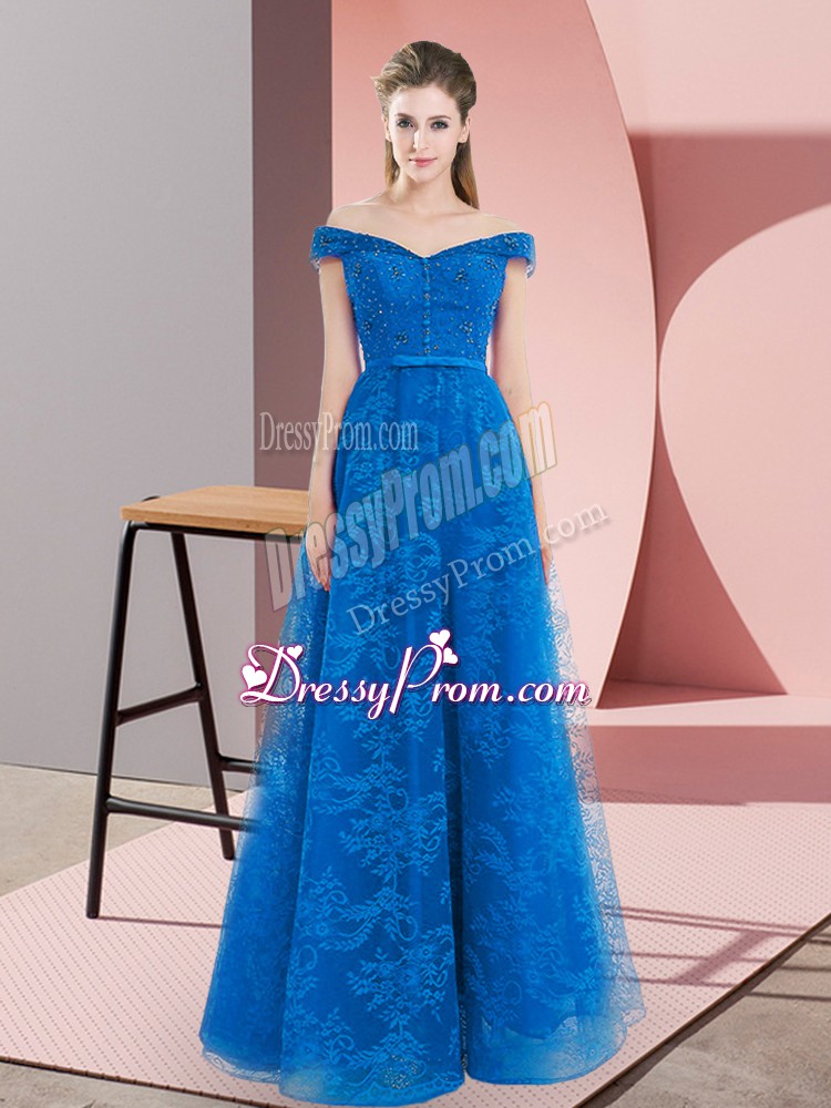 Latest Off The Shoulder Sleeveless Lace Up Beading Prom Evening Gown in Blue